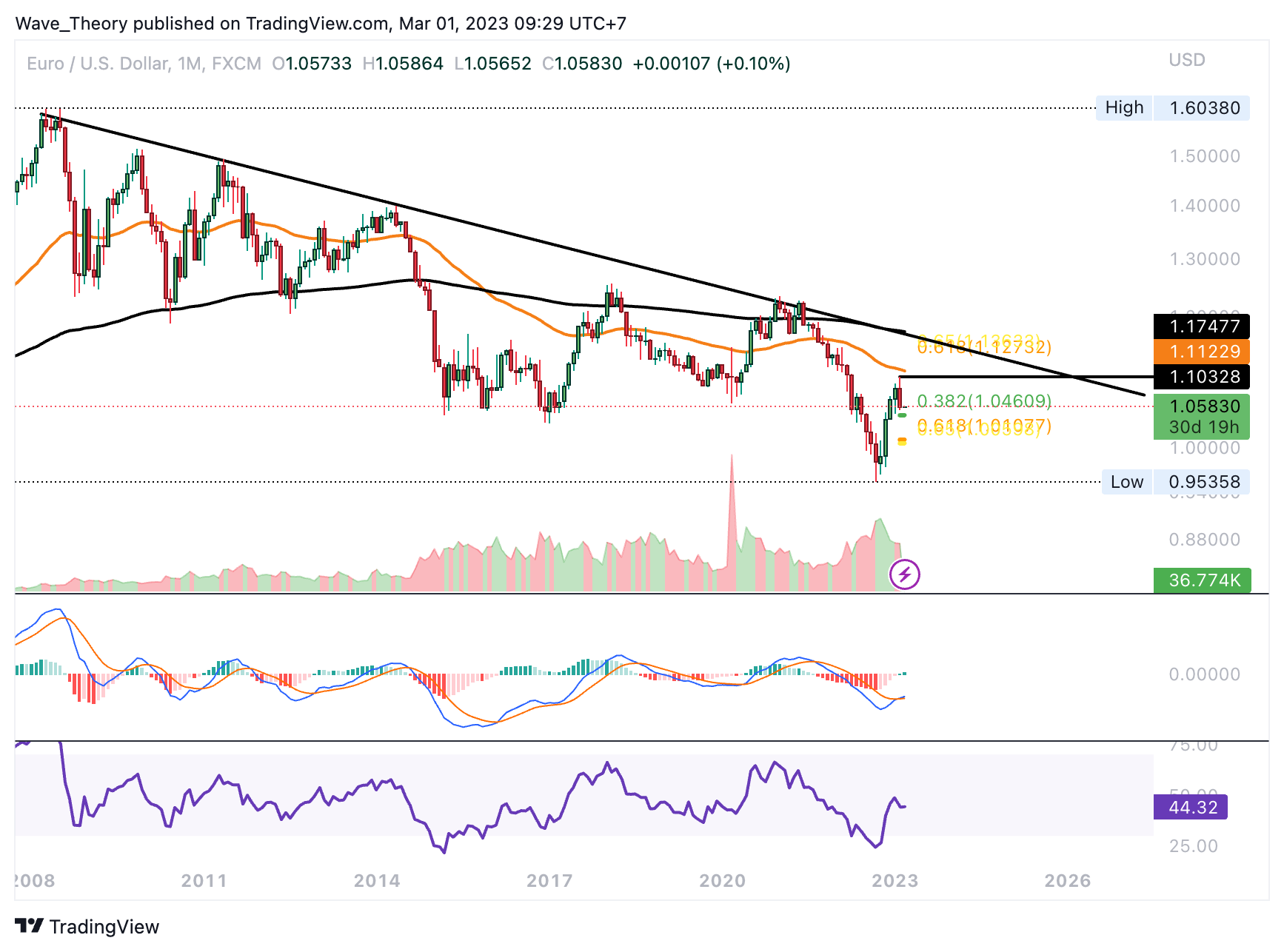Sponsored SponsoredSollte EURUSD an den Fib Unterstützungen bullisch abprallen, um die Aufwärtsbewegung fortzusetzen, wartet spätestens zwischen rund 1,12 USD und 1,17 USD signifikanter Widerstand auf den Euro Kurs. Dort laufen Golden Ratio Widerstand, 200-Monate-EMA und die bärische Trendlinie des gesamten Bärenmarktes zusammen.