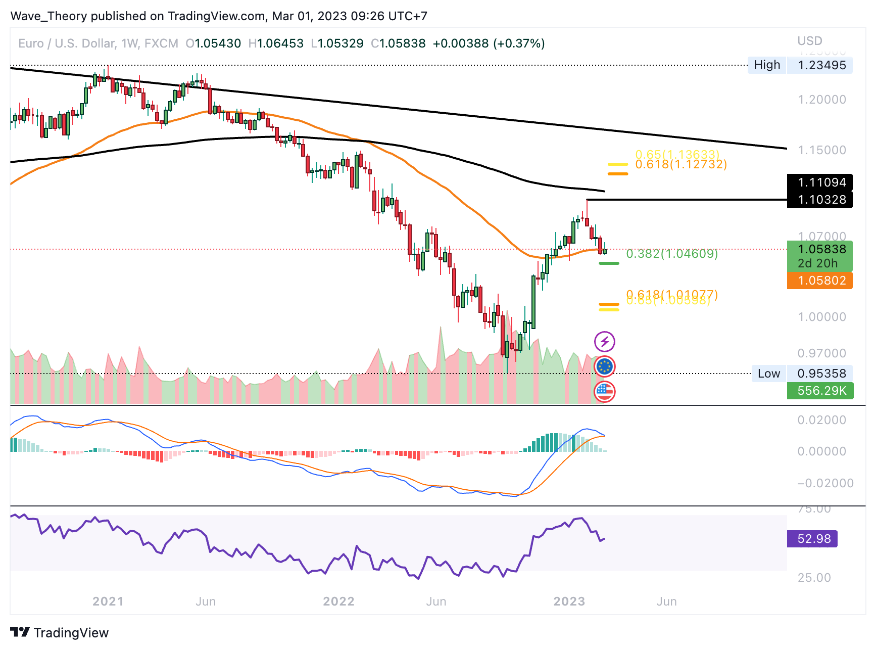 Denn seither befindet sich der Kurs in einer starken Korrekturbewegung. Aktuell stößt der Euro am 50-Wochen-EMA bei rund 1,058 USD auf signifikante Unterstützung. Sollte diese bärisch gebrochen werden, warten spätestens bei rund 1,046 USD und bei rund 1,01 USD die nächsten signifikanten Fib Unterstützungen.