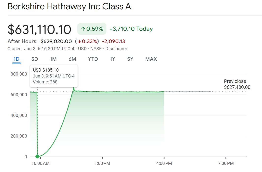 Um 09:50 tauschten Händler etwa ein Dutzend Berkshire Class A (BRK.A) Aktien für 185,10 USD. Die Aktie hatte am Freitag mit 627.400 USD geschlossen. Nach dem Vorfall gab die NYSE bekannt, dass jeder Handel zwischen 09:50 und 09:51 zu einem Preis von 603.718,30 USD oder darunter storniert wird.