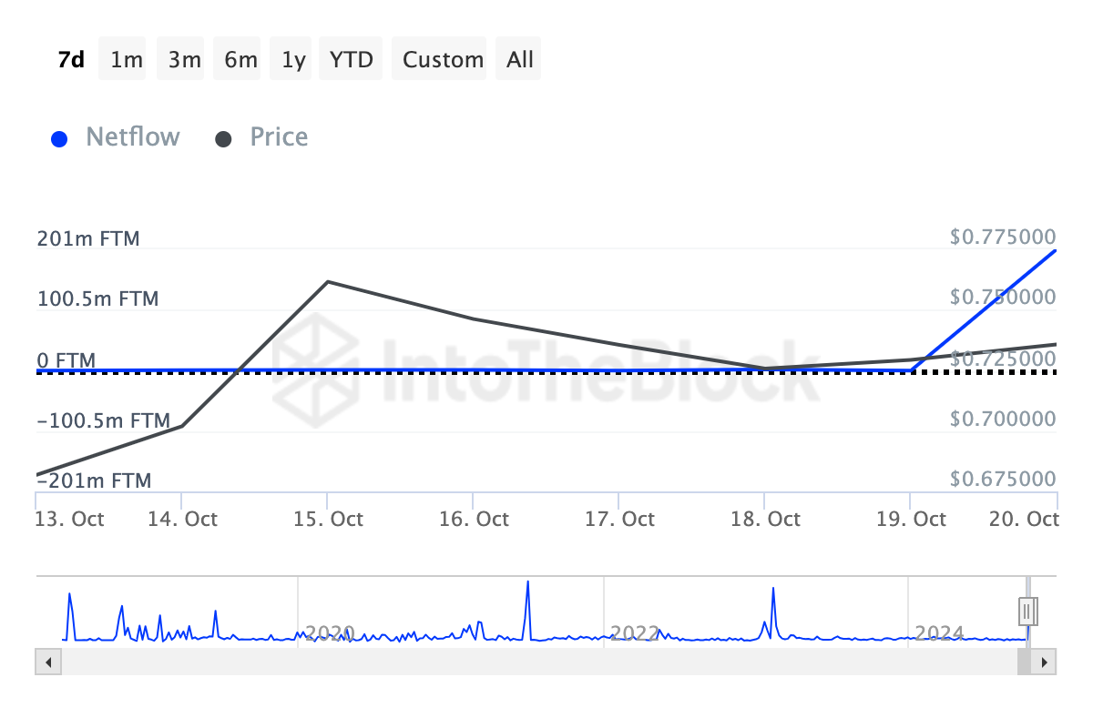 Zunächst war am 19. Oktober der Nettofluss negativ, was darauf hindeutete, dass die meisten Krypto-Wale mehr FTM verkauften als kauften. Mittlerweile ist der Nettofluss jedoch auf 201 Millionen gestiegen, was auf einen Stimmungswandel hindeutet und ein bullisches Signal sein könnte.