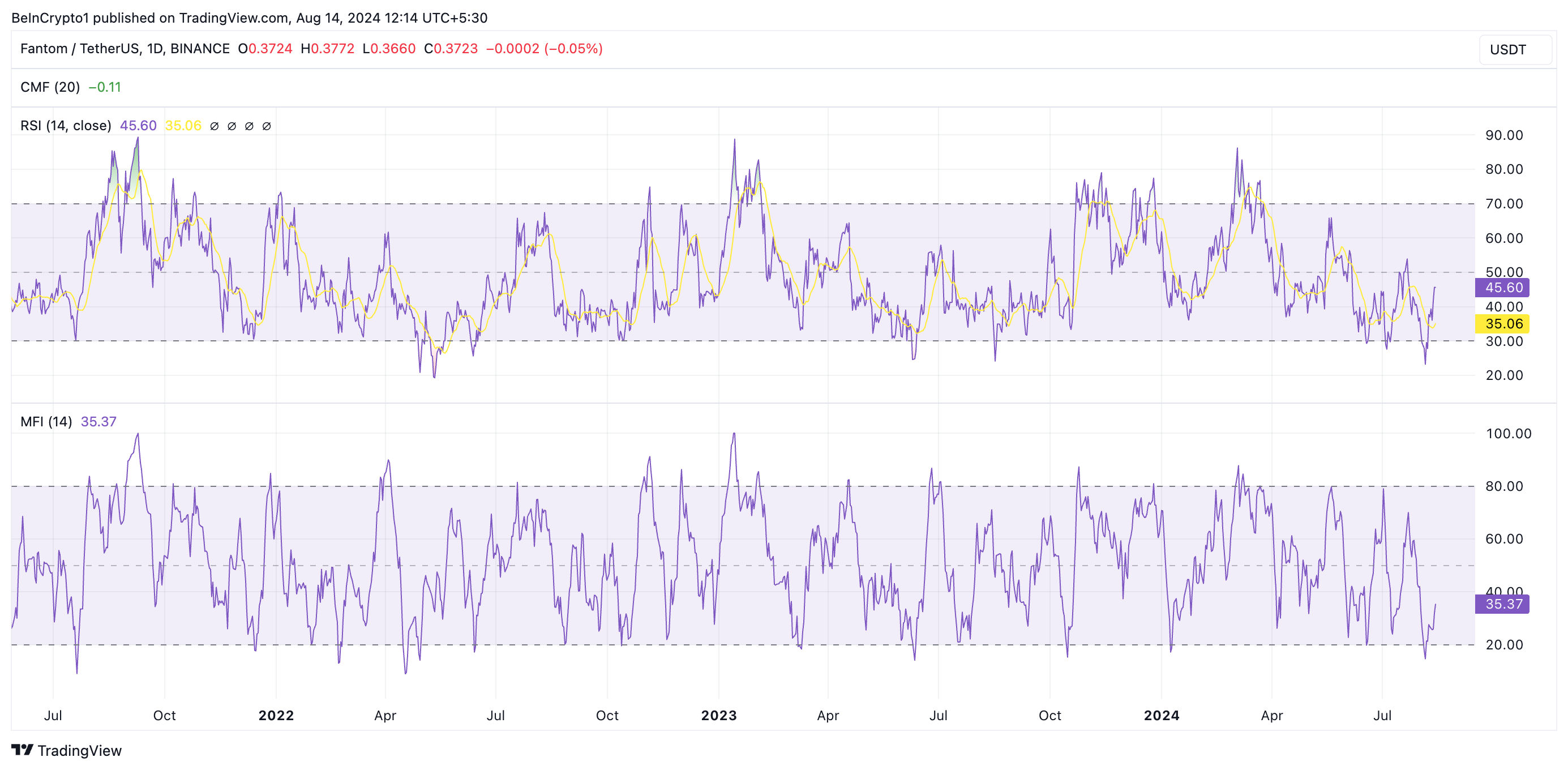 Die Momentum-Indikatoren von FTM liegen derzeit unter ihren neutralen 50er-Bereichen, was auf einen deutlichen Rückgang des Kaufdrucks hinweist. Aktuell ist der Relative Strength Index (RSI) des Coins 45,60, während sein Money Flow Index (MFI) 35,37 beträgt.