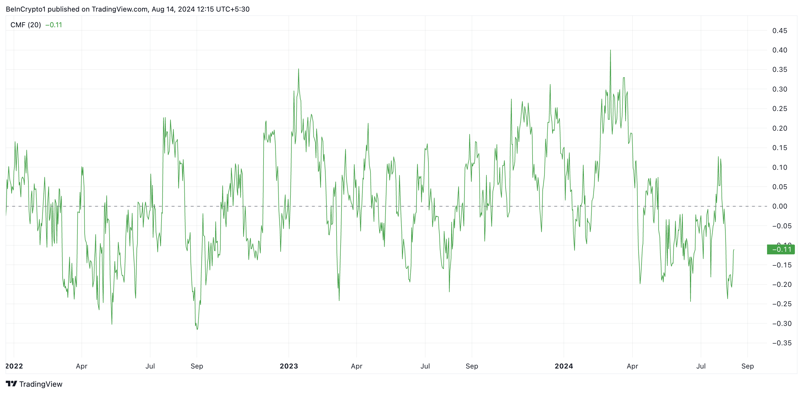 Dieser Indikator misst den Geldfluss in und aus dem Markt. Ein CMF-Wert unter null deutet auf Marktschwäche hin, was auf einen Liquiditätsabfluss hindeutet. Er wird oft als Vorläufer eines Kursrückgangs angesehen.
