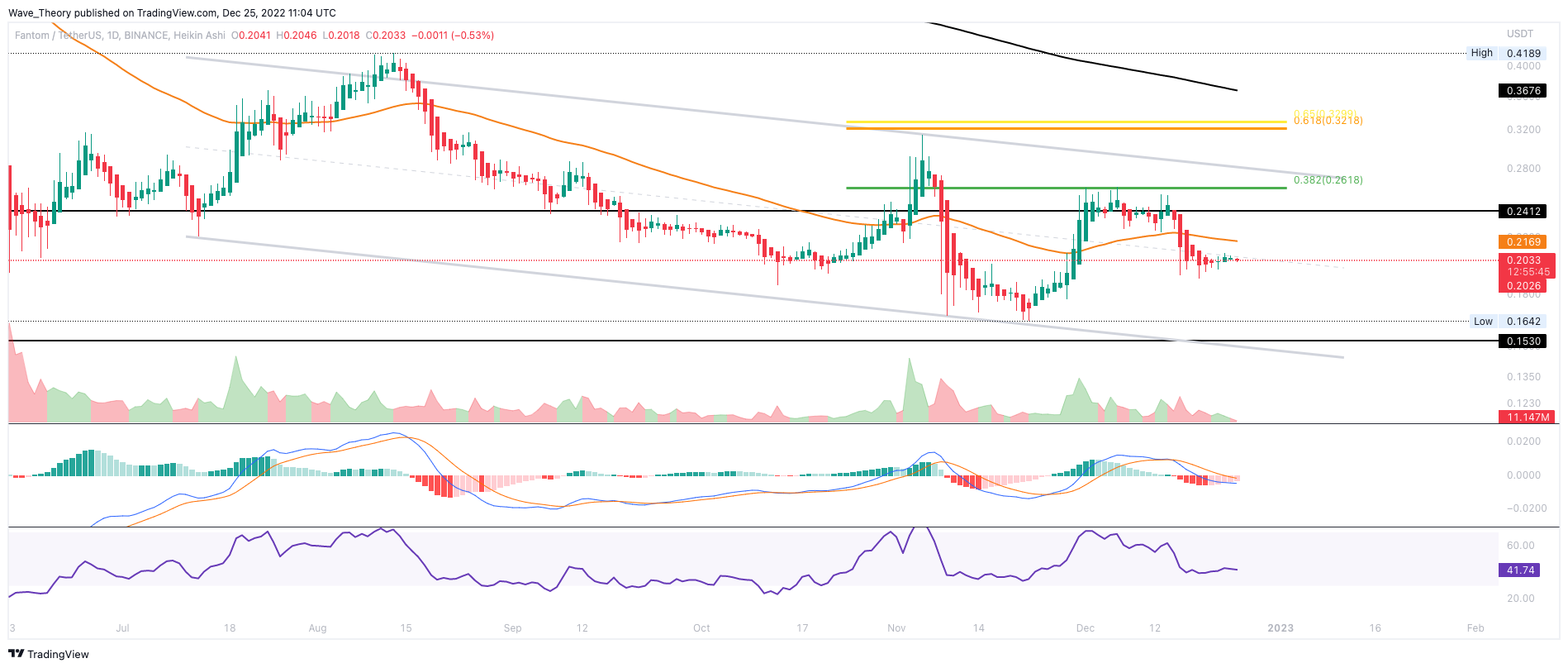 Sollte Fantom die Golden Ratio Unterstützung bei rund 0,2 USD bärisch brechen, könnte der Kurs auf das Jahrestief bei rund 0,164 USD zurückkehren. Denn mittelfristig befindet sich Fantom noch immer in einem parallelen Abwärtskanal.