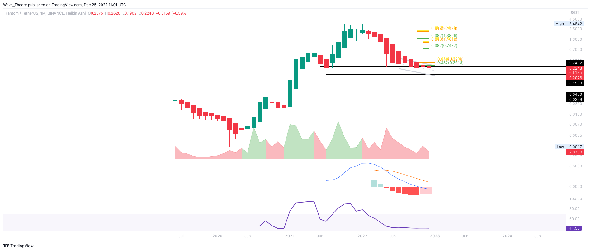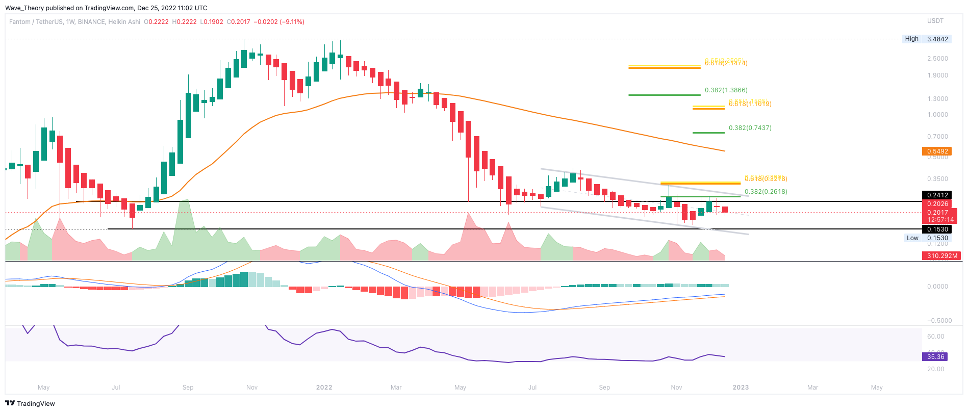 FTM befindet sich nach wie vor in einer starken Unterstützungszone zwischen 0,153 USD und 0,24 USD. Da sich FTM in einem parallelen Abwärtskanal befindet, wird sich der FTM Kurs womöglich zur unteren Trendlinie des Kanals zurückbewegen, sofern die Golden Ratio Unterstützung bei rund 0,2 USD bärisch gebrochen wird.