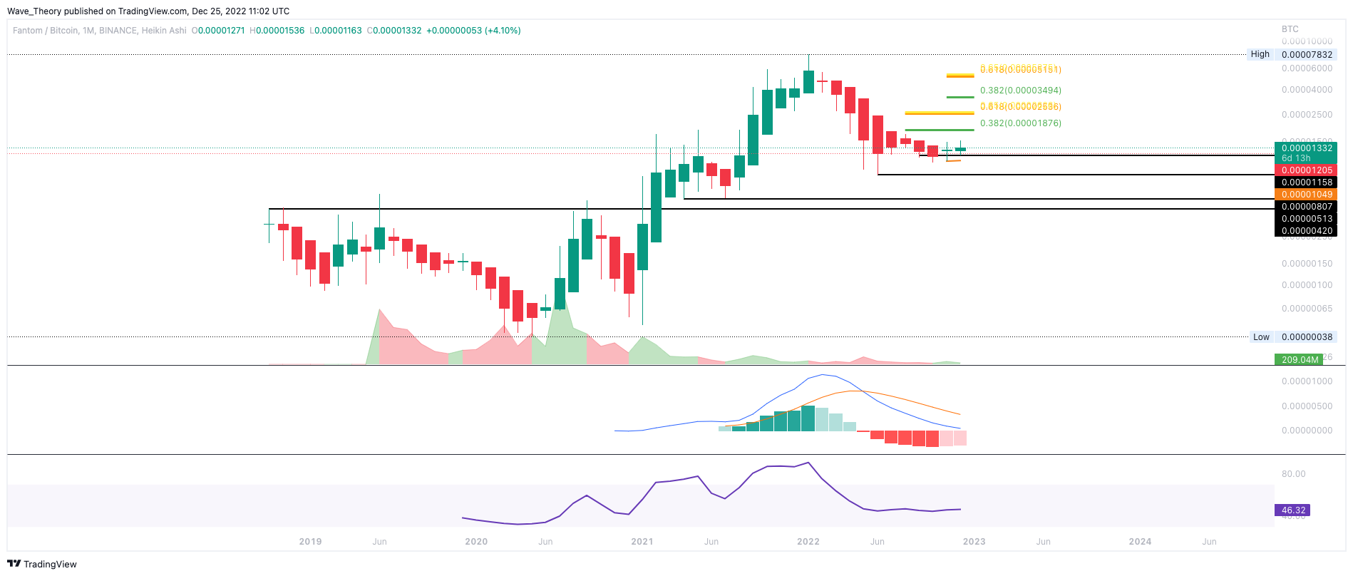 Letzten Monat konnte der FTM Kurs am 50-Monate-EMA bei rund 0,0000105 BTC abprallen. Damit liegen die nächsten signifikanten Fib Widerstände bei rund 0,00001876 BTC und 0,0000255 BTC.
