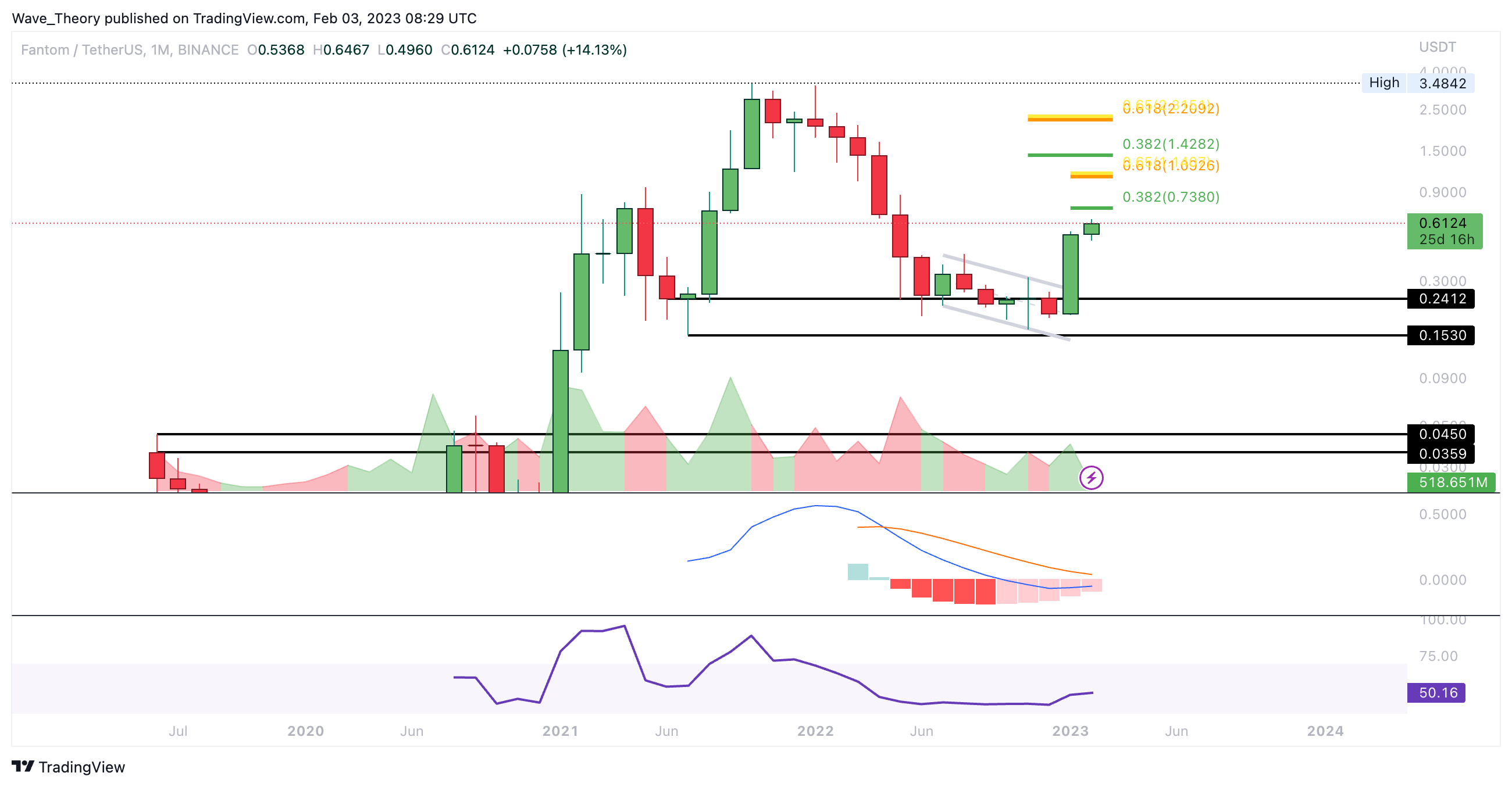 Der FTM Kurs hätte das neue Jahr kaum bullischer beginnen können. Im Januar formte Fantom eine monströse bullische Monatskerze, woran FTM auch in diesem Monat anzuknüpfen scheint. FTM findet dabei bei rund 0,738 USD den nächsten signifikanten Fib Widerstand.