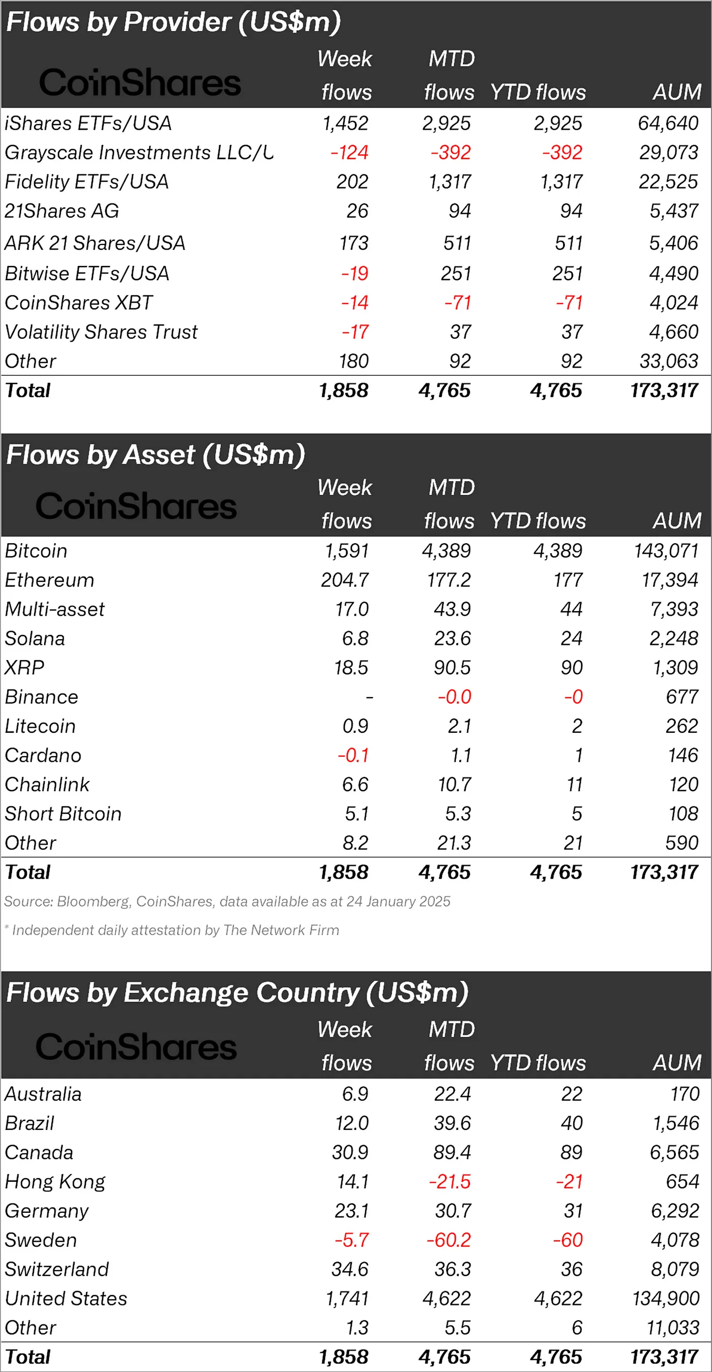 Besonders auffällig war, dass es keine Abflüsse aus digitalen Anlageprodukten gab. Dies ist ein seltener und ermutigender Trend, der die allgemeine Marktstimmung widerspiegelt.