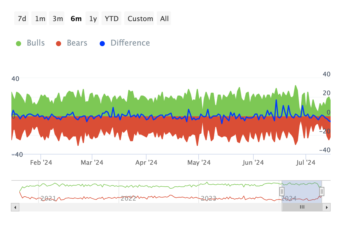 Dieser Indikator für Bullen und Bären unterstützt diese Aussage. In diesem Kontext sind Bullen Adressen, die einen Prozent des gesamten Handelsvolumens gekauft haben. Bären sind andererseits Adressen, die einen ähnlichen Betrag verkauft haben.