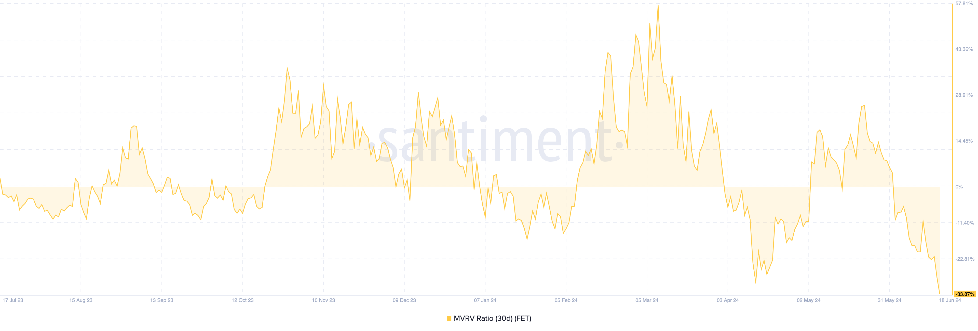 Zum Zeitpunkt der Veröffentlichung liegt das Verhältnis bei -33,78 Prozent. Historisch gesehen erreicht FET eine Gelegenheitszone, wenn das MVRV-Verhältnis zwischen -10,18 Prozent und -29,99 Prozent liegt.