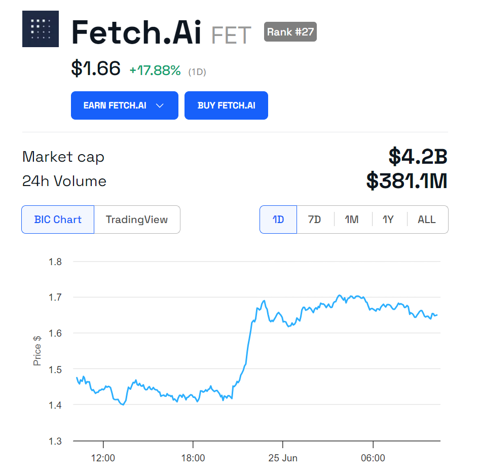 Trotz der Unklarheit hat dieser Tweet Spekulationen unter den Krypto-Enthusiasten angeheizt, was dazu führte, dass der Kurs von FET von 1,42 USD auf 1,70 USD anstieg. Zum Zeitpunkt der Abfassung dieses Textes wird FET jedoch zu 1,66 USD gehandelt.