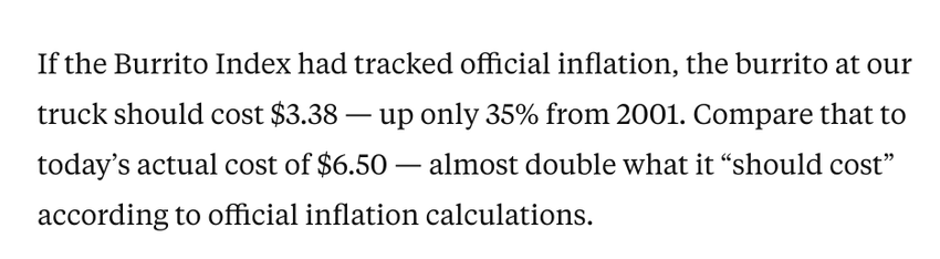 Das ist schwer zu glauben, wenn ein Burrito im Jahr 2001 noch $2.50 kostete, $5 in 2010 und schließlich $6.50 in 2016. Wer die richtigen Zahlen will, orientiert sich wohl bald am Bratwurst oder Kebabindex.