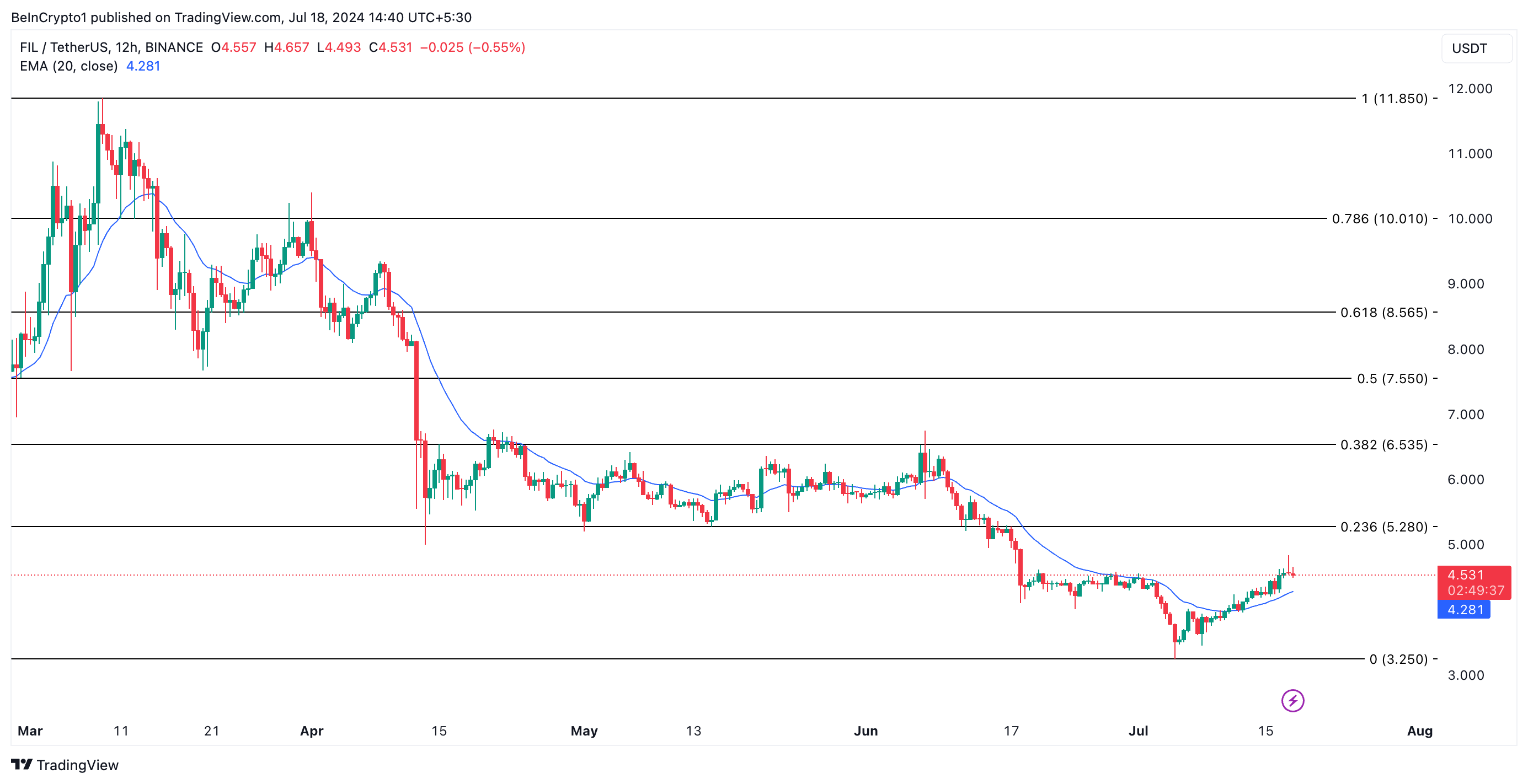 Nach der Ankündigung schnellte FIL auf 4,80 USD hoch und erreichte damit den höchsten Kurs des letzten Monats. Allerdings wurde der Kurs des Altcoins korrigiert. Derzeit wird er zu 4,54 USD gehandelt, was einem Rückgang von sechs Prozent entspricht.