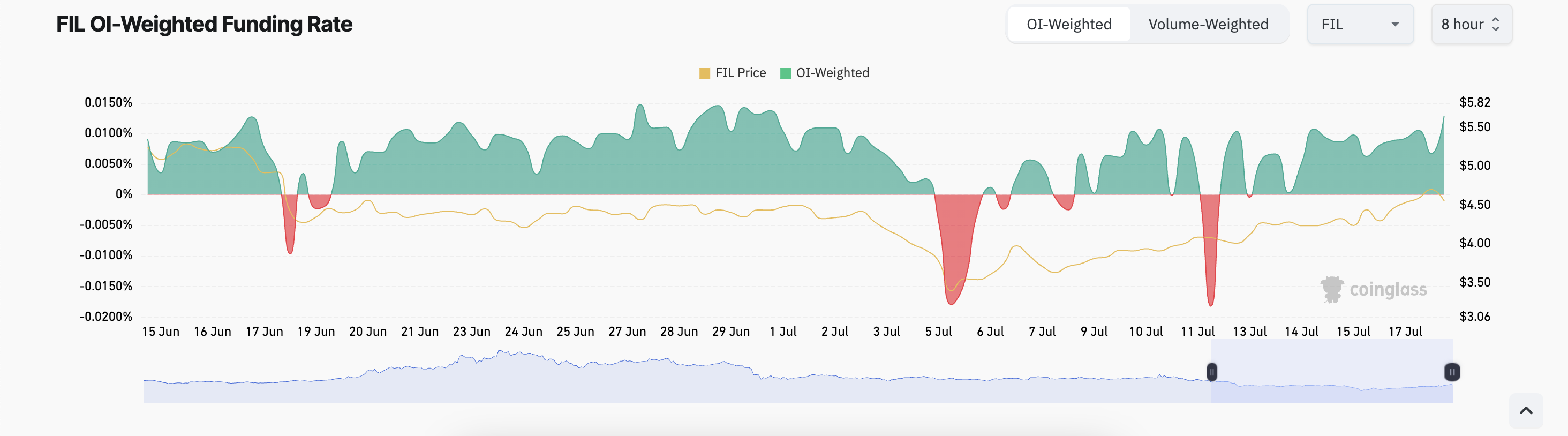 Es ist wichtig zu beachten, dass ein Anstieg des Handelsvolumens eines Assets oft die Marktstimmung anzeigt. Wenn beispielsweise das meiste Handelsvolumen aus Long-Positionen besteht, könnte dies eine bullische Stimmung signalisieren. Das ist bei FIL der Fall, wie aus seiner Finanzierungsrate hervorgeht, die seit dem 13. Juli positiv geblieben ist.