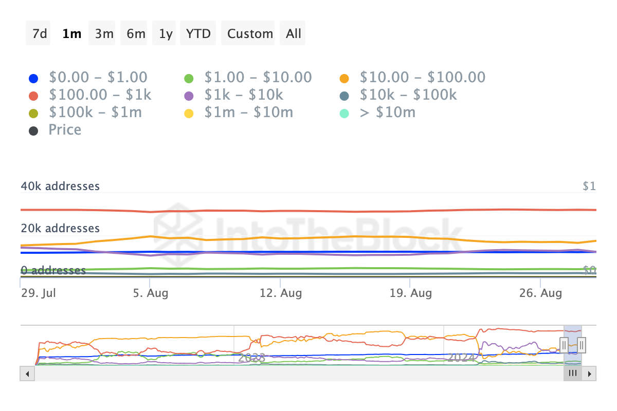 Jedoch ist diese Wallet nicht die einzige Entität, die FLOKI ablädt. Laut IntoTheBlock hat die Anzahl der Adressen, die den Memecoin im Wert von 100.000 bis 10 Millionen USD halten, abgenommen.