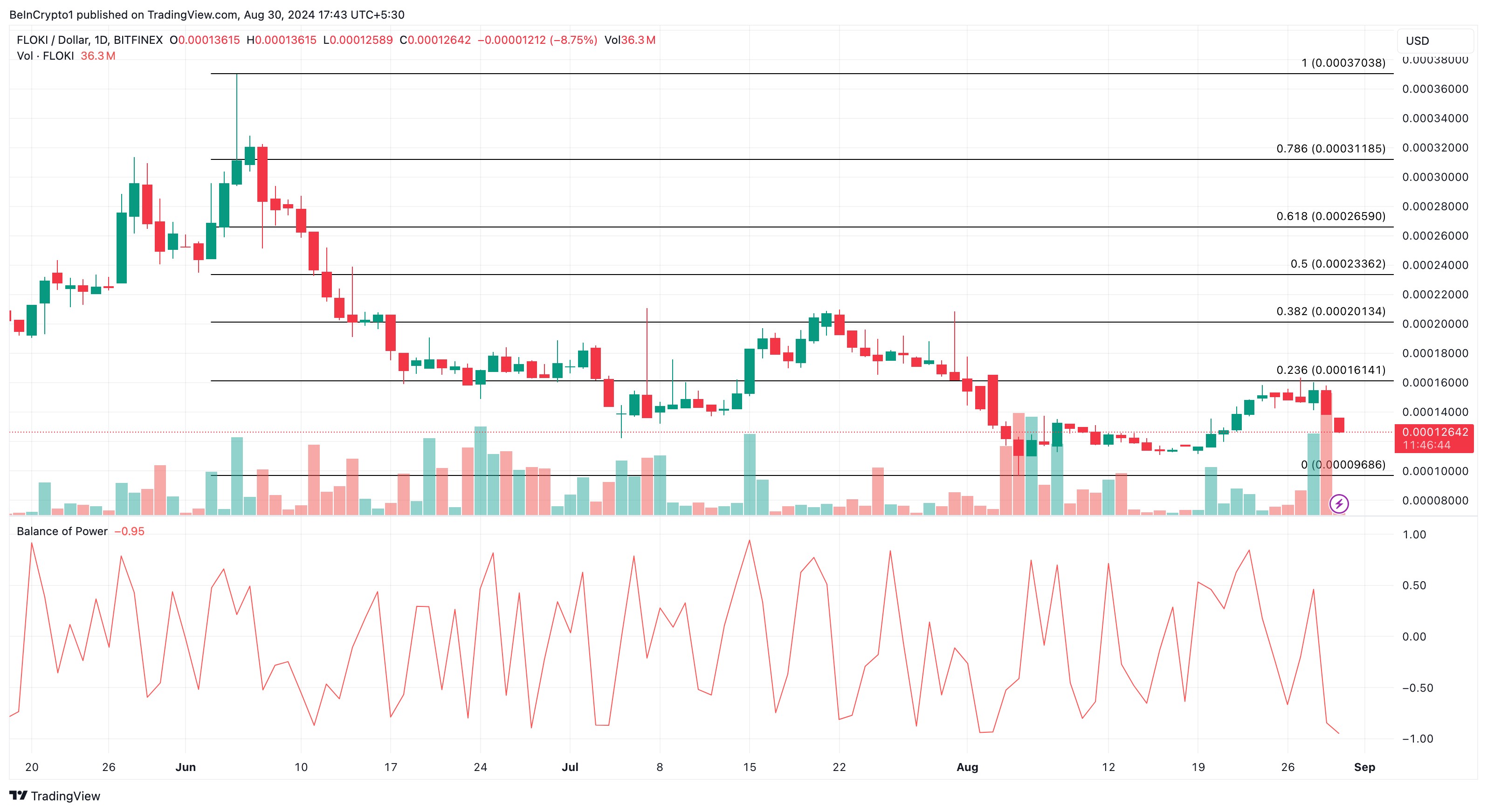 Aus technischer Sicht könnte der FLOKI Kurs weiter fallen, wie der Balance of Power (BoP) anzeigt. Der BoP ist ein technischer Indikator, der die Stärke von Käufern gegenüber Verkäufern auf dem Markt misst. Ein höherer BoP-Wert spiegelt stärkeren Käuferdruck wider.