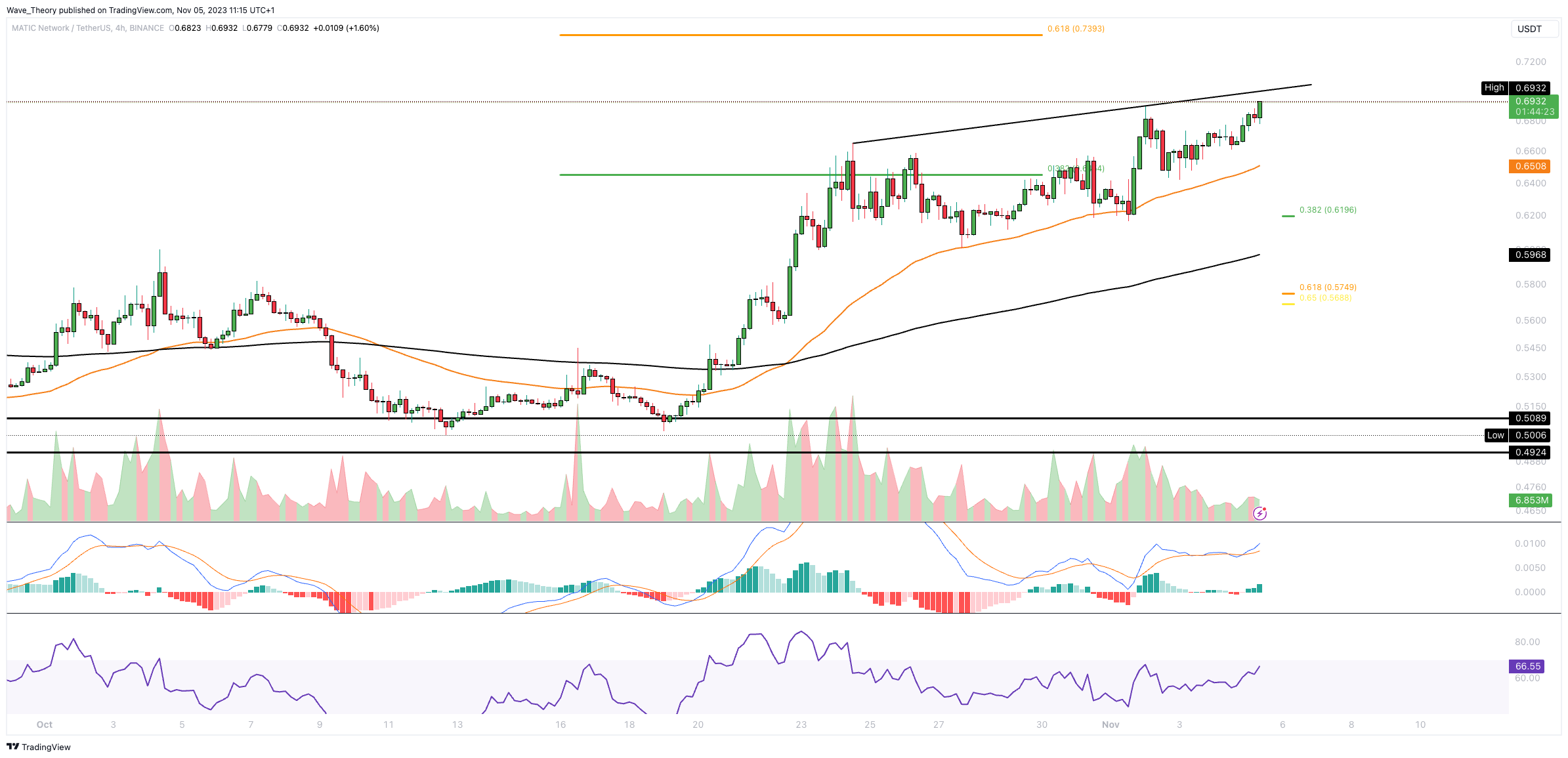 Sponsored SponsoredTatsächlich sieht es im 4H-Chart eher nach einer Fortsetzung der Aufwärtsbewegung aus. Demnach könnte Polygon schon bald die Golden Ratio bei rund 0,75 USD erreichen.