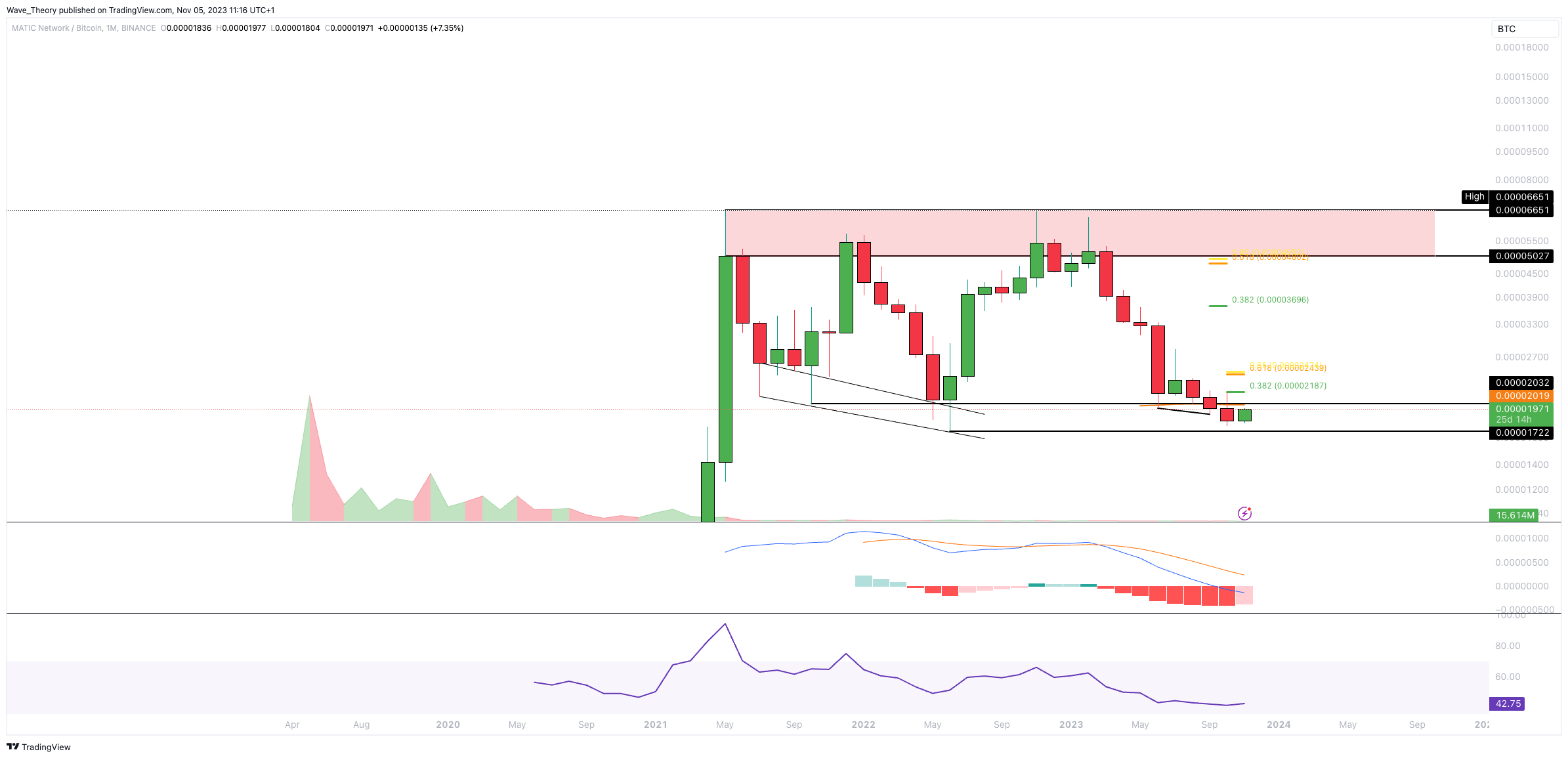 Gegen BTC scheint der MATIC Kurs in diesem Monat an der Unterstützungszone zwischen rund 0,00001724 BTC und 0,0000187 BTC abzuprallen. Damit warten bei rund 0,00002187 BTC respektive 0,0000245 BTC die nächsten signifikanten Fib Widerstände.