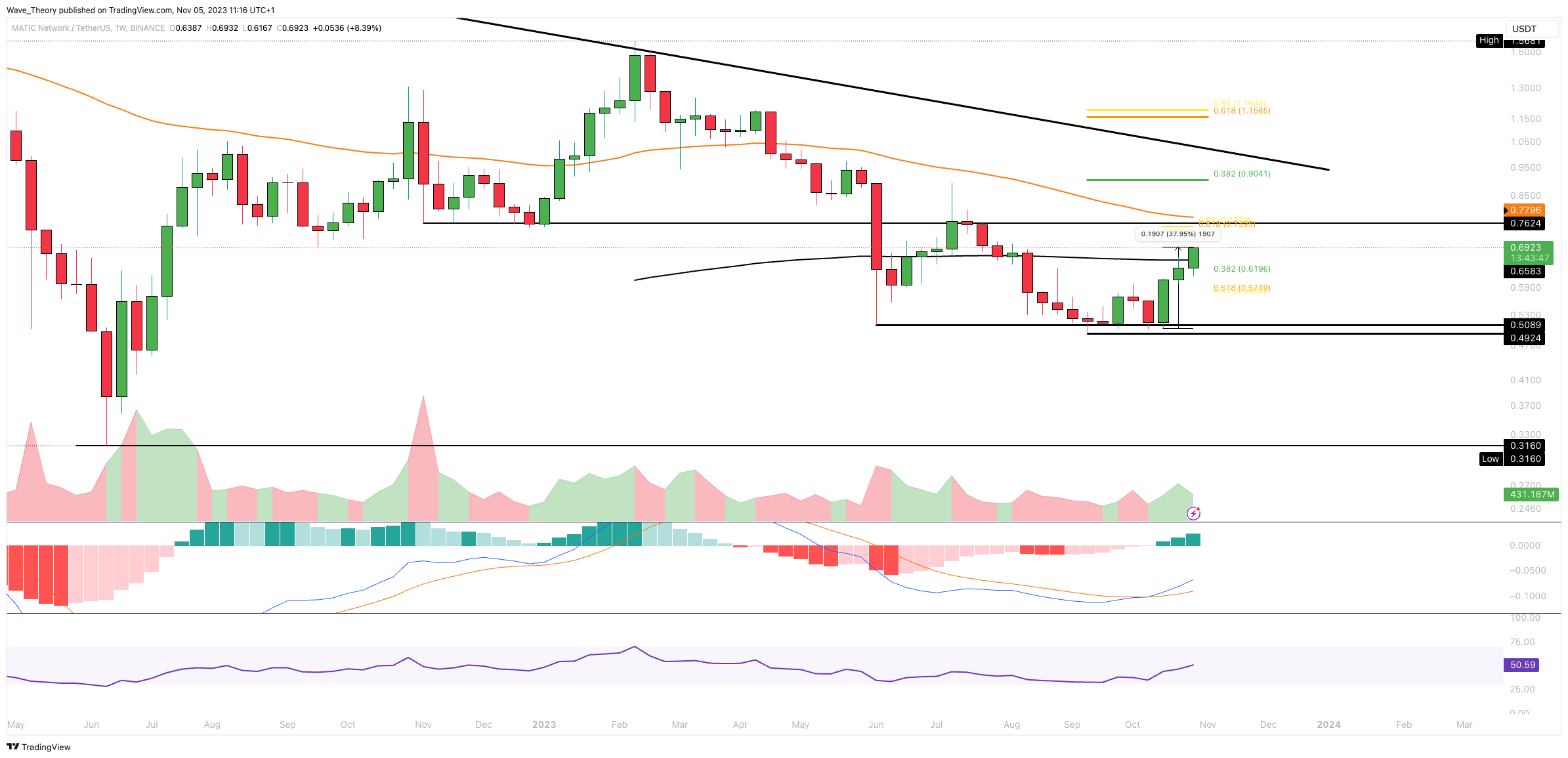 Der MATIC Kurs konnte seit vorletzter Woche rund 38 % steigen. Auch den 200-Wochen-EMA Widerstand bei rund 0,66 USD konnte Polygon hinter sich lassen.