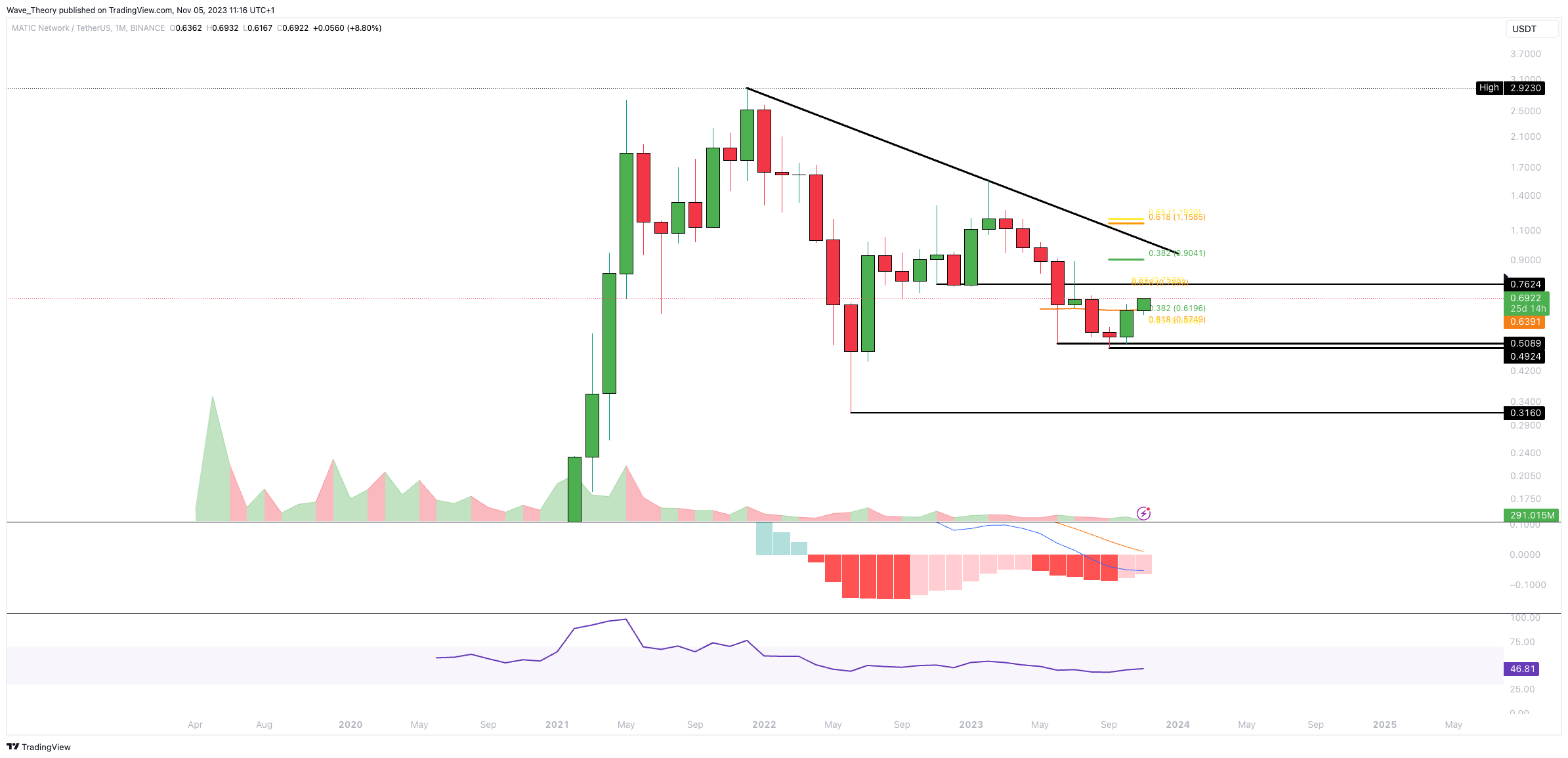 Demnach sieht es auch im Monatschart nach einer Fortsetzung der Aufwärtsbewegung aus. Damit könnte Polygon die Golden Ratio bei rund 0,74 USD anvisieren.