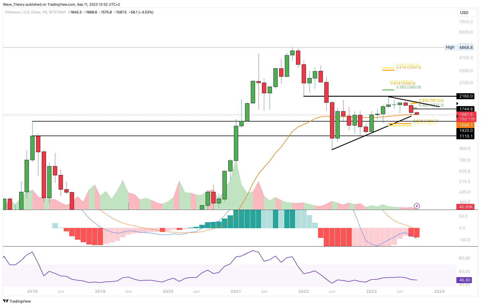 Ethereum befindet sich derzeit noch am 50-Monate-EMA, welcher bei rund 1.580 USD als Unterstützung dient. Wenn diese Unterstützung bricht, könnte sich Ethereum definitiv zur Golden Ratio bei rund 1.350 USD bewegen. Wenn auch diese Unterstützung nicht hält, könnte Ethereum auf rund 1.110 USD korrigieren.