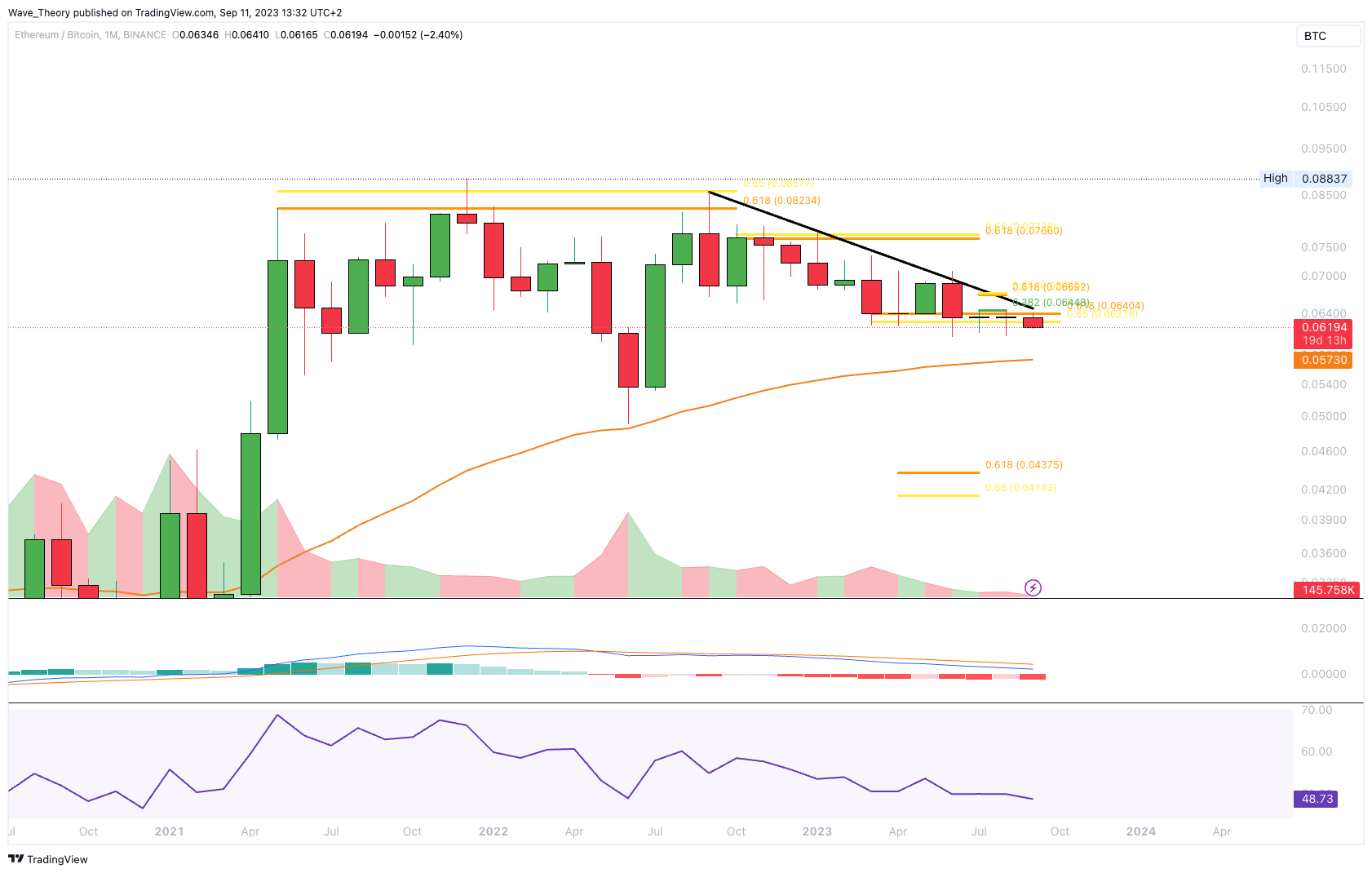 Gegen Bitcoin könnte der Ethereum Kurs jetzt die Golden Ratio Unterstützung bei rund 0,063 BTC bärisch brechen. Daraufhin könnte der Kurs zum 50-Monate-EMA bei rund 0,057 BTC korrigieren. Das impliziert ein Abwärtspotenzial von rund 9 %.