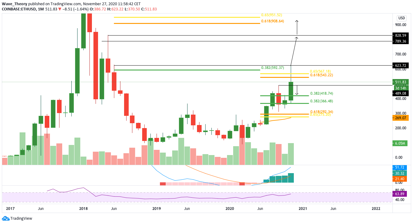 Im Monatskurs konnte der Ethereum Kurs im November immer noch fantastische Kursgewinne verzeichnen. Wichtig ist nun, dass der Ethereum Kurs über der Golden Ratio bei 550 USD schließt. Andernfalls könnte es das lokale Hoch dieses Bullentrends markieren, und wieder in einen Bärentrend wechseln.