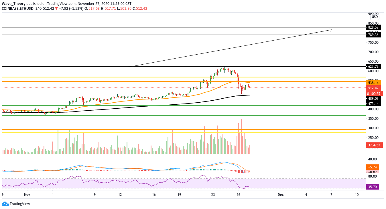 Tatsächlich könnte kurzfristig sogar eine Aufwärtsbewegung folgen, denn im 4H Kurs entwickeln sich die Indikatoren leicht bullisch. So ist dabei entscheidend ob der Ethereum Kurs den 50-4h-EMA bei 538 USD durchbrechen kann.