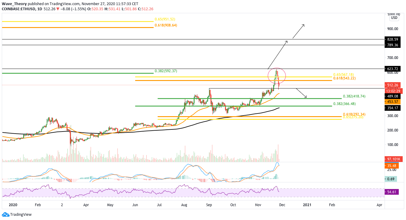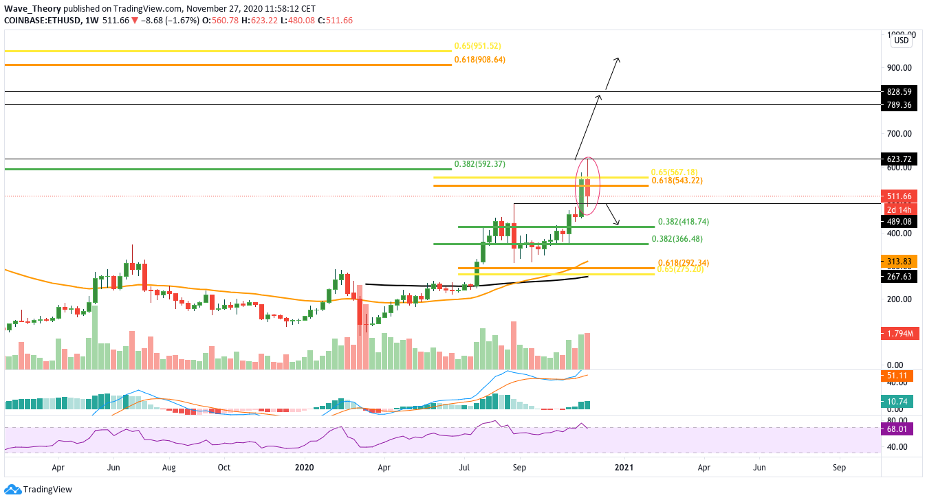 Mit dem bullischen Wochenstart sah es zunächst danach aus, dass Bitcoin den Golden Ratio Widerstand bei 550 USD hinter sich lässt. Zwar überstieg der Ethereum Kurs zunächst das 0,382 Fib Niveau bei 592 USD und erreichte 623 USD, jedoch konnte kein Anstieg bis zum nächsten Widerstand zwischen rund 790 – 830 USD erfolgen.