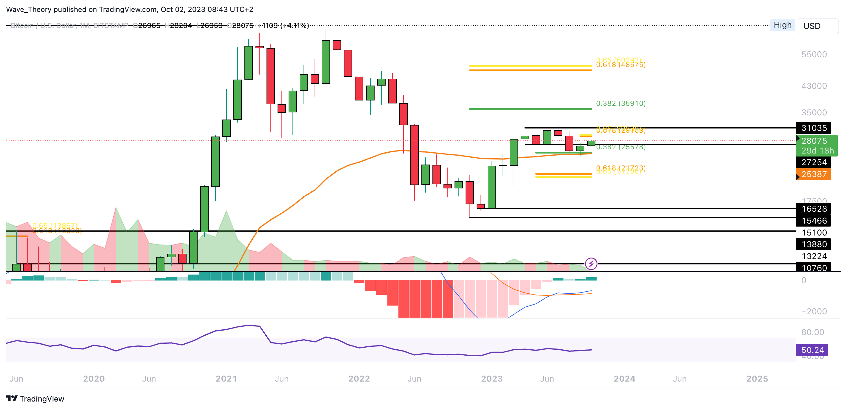 SponsoredDer Bitcoin Kurs hält sich über dem 0,382 Fib Niveau am 50-Monate-EMA bei rund 25.580 USD