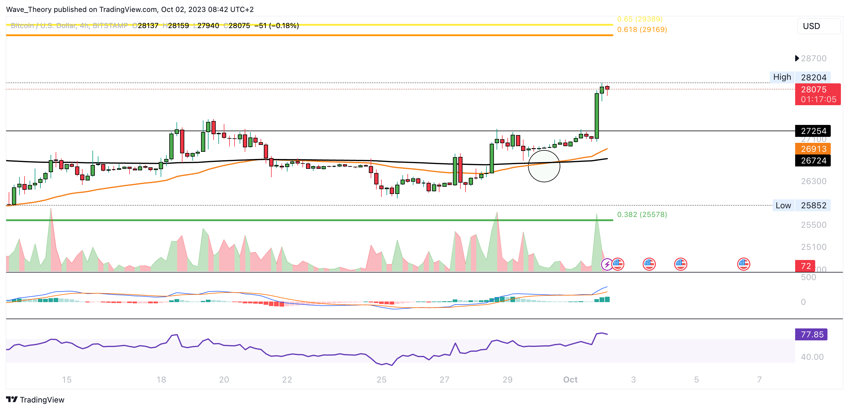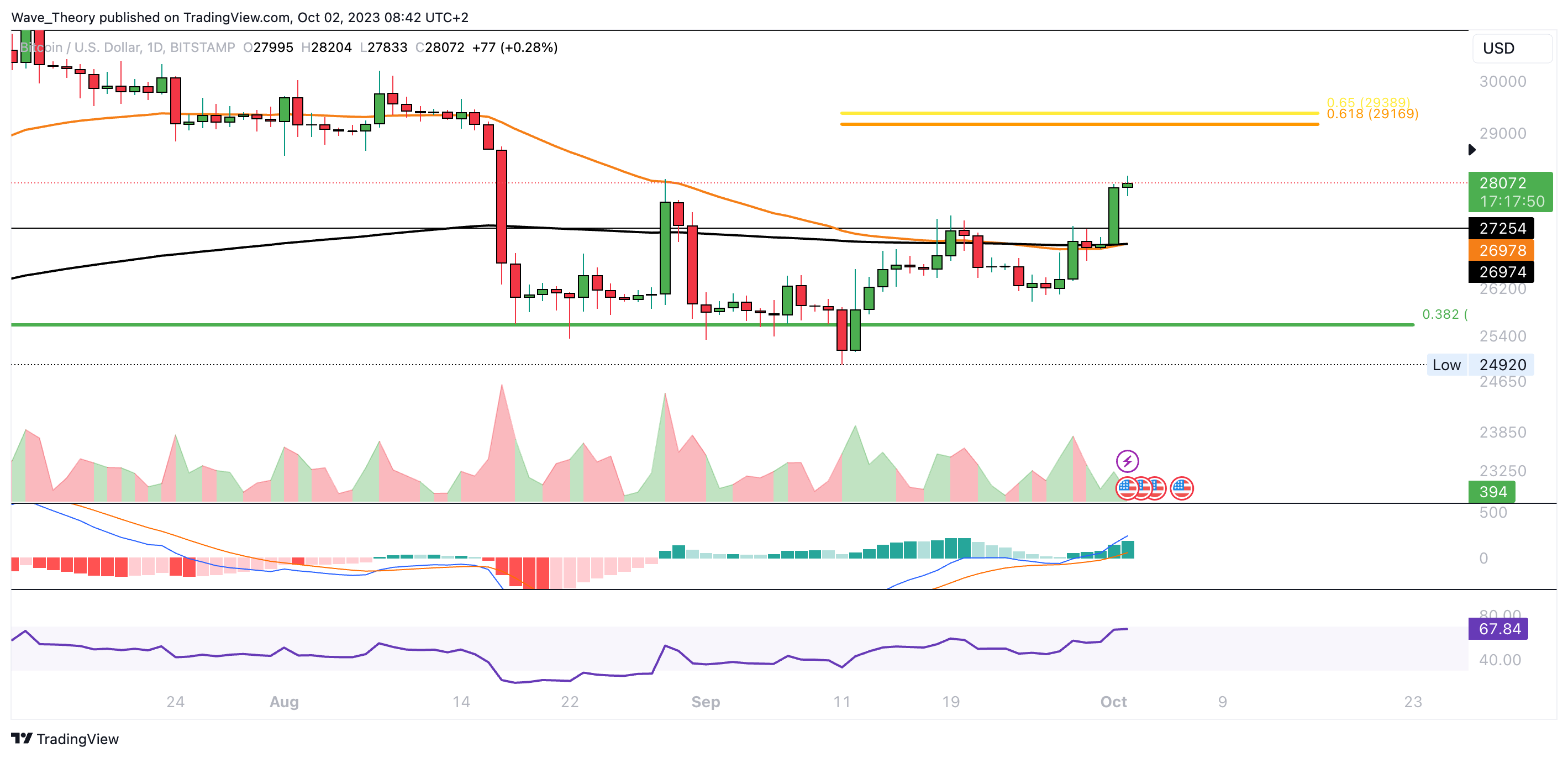 Wenn Bitcoin die Aufwärtsbewegung jetzt fortsetzt, findet er bei rund 29.200 USD den nächsten signifikanten Fibonacci Widerstand. Bricht Bitcoin diesen, könnte der den letzten Hochpunkt bei rund 32.000 USD anvisieren.