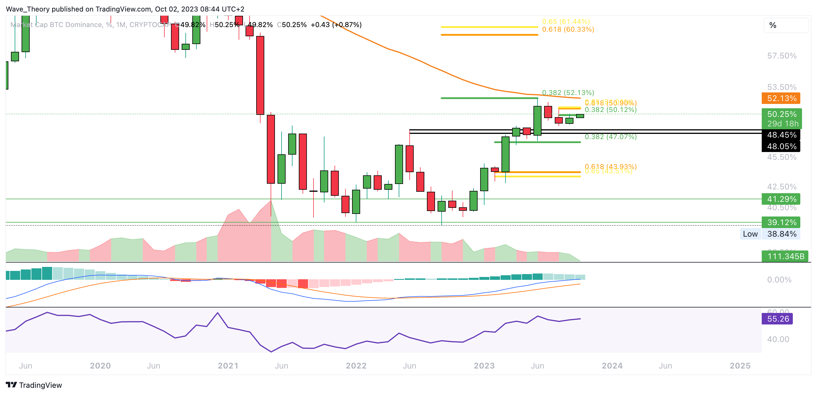 Damit stößt BTC jetzt bei rund 50,12 % und bei rund 50,9 % auf signifikante Fibonacci Widerstände. Darüber hinaus wartet am 50-Monate-EMA bei rund 52,13 % signifikanter Widerstand auf Bitcoin. Dort liegt zudem das wichtige 0,382 Fib Niveau, woran BTC vor einigen Monaten gescheitert ist. Wenn Bitcoin diese Widerstände bricht, könnte die Bitcoin Dominanz die Golden Ratio bei rund 60,5 % anvisieren.