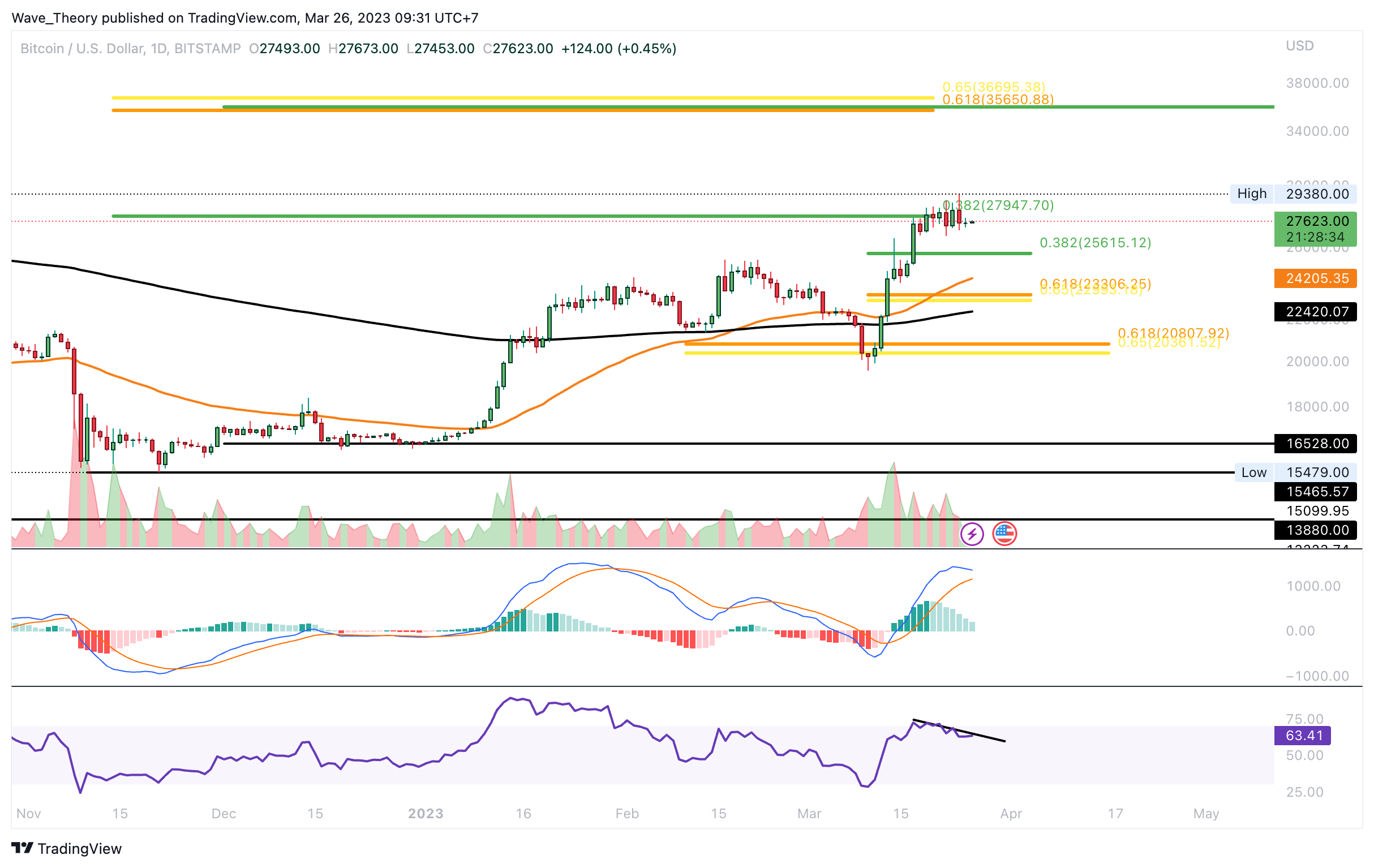 Der Bitcoin Kurs konnte das Kursziel bei rund 28.000 USD abholen und sogar kurzzeitig bis rund 29.380 USD steigen. Doch damit befindet sich Bitcoin noch immer am 0,382 Fib Widerstand, welcher noch nicht bullisch gebrochen wurde. Zudem fängt der BTC Kurs an zu schwächeln, während der RSI eine bärische Divergenz aufweist.