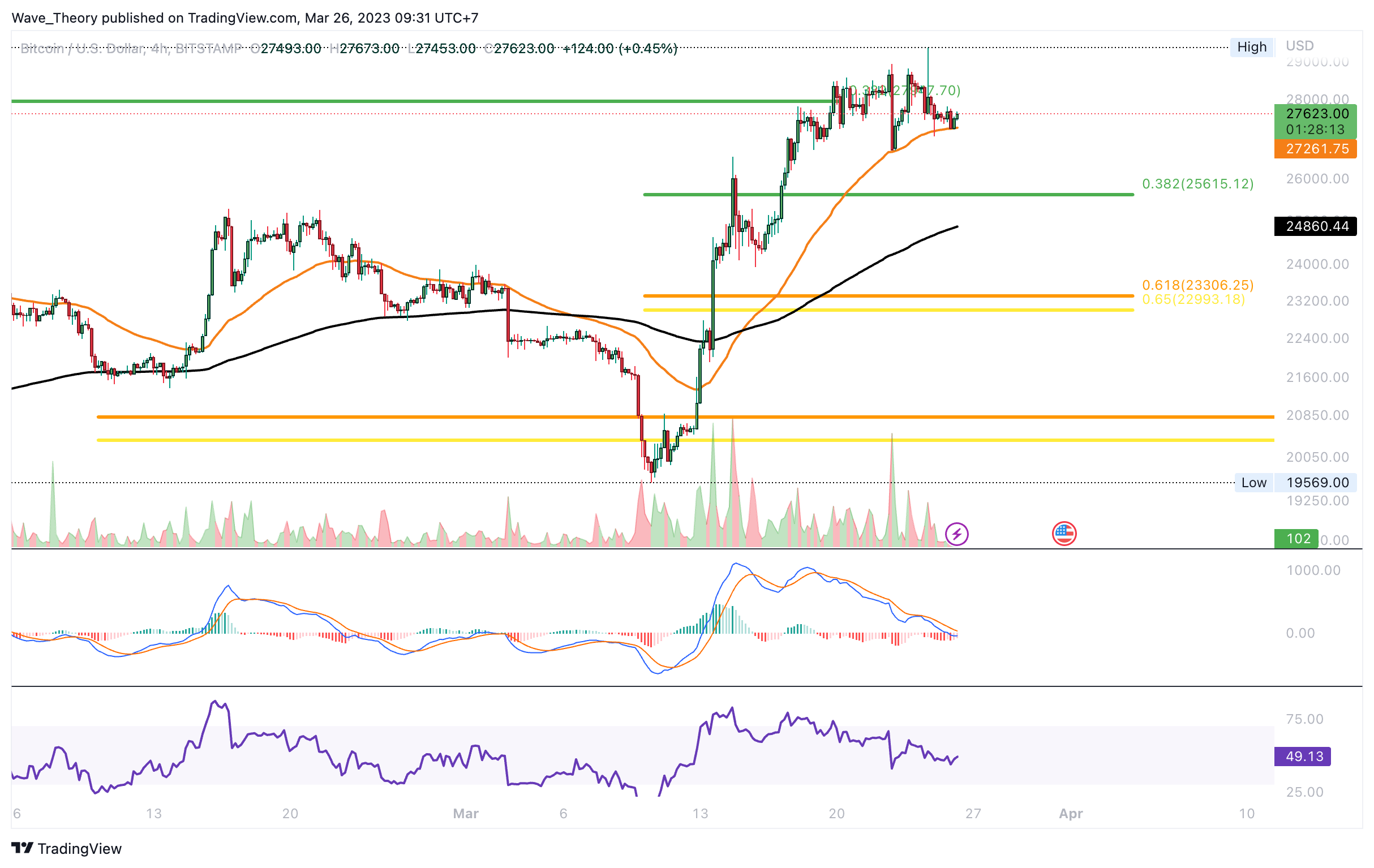 Auch im 4H-Chart bleibt das Golden Crossover intakt, womit der Trend kurzfristig bullisch bestätigt bleibt. Jedoch weist auch hier der RSI eine bärische Divergenz auf, während die MACD Linien bärisch überkreuzt sind. Bisher konnte Bitcoin an der 50-4H-EMA Unterstützung bei rund 27.262 USD abprallen. Doch wenn diese Unterstützung bricht, könnte BTC zu den nächsten Fib Unterstützungen korrigieren.