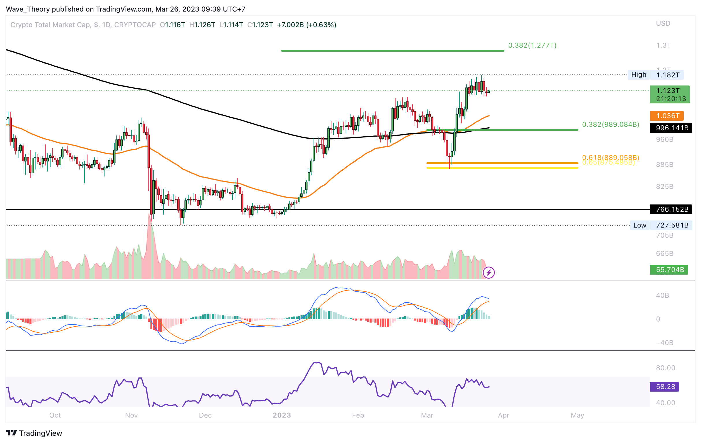 Der Kryptomarkt findet im Fall einer anstehenden Korrekturbewegung bei rund 989 Milliarden USD und bei rund 880 Milliarden USD die nächsten signifikanten Fibonacci Unterstützungen.