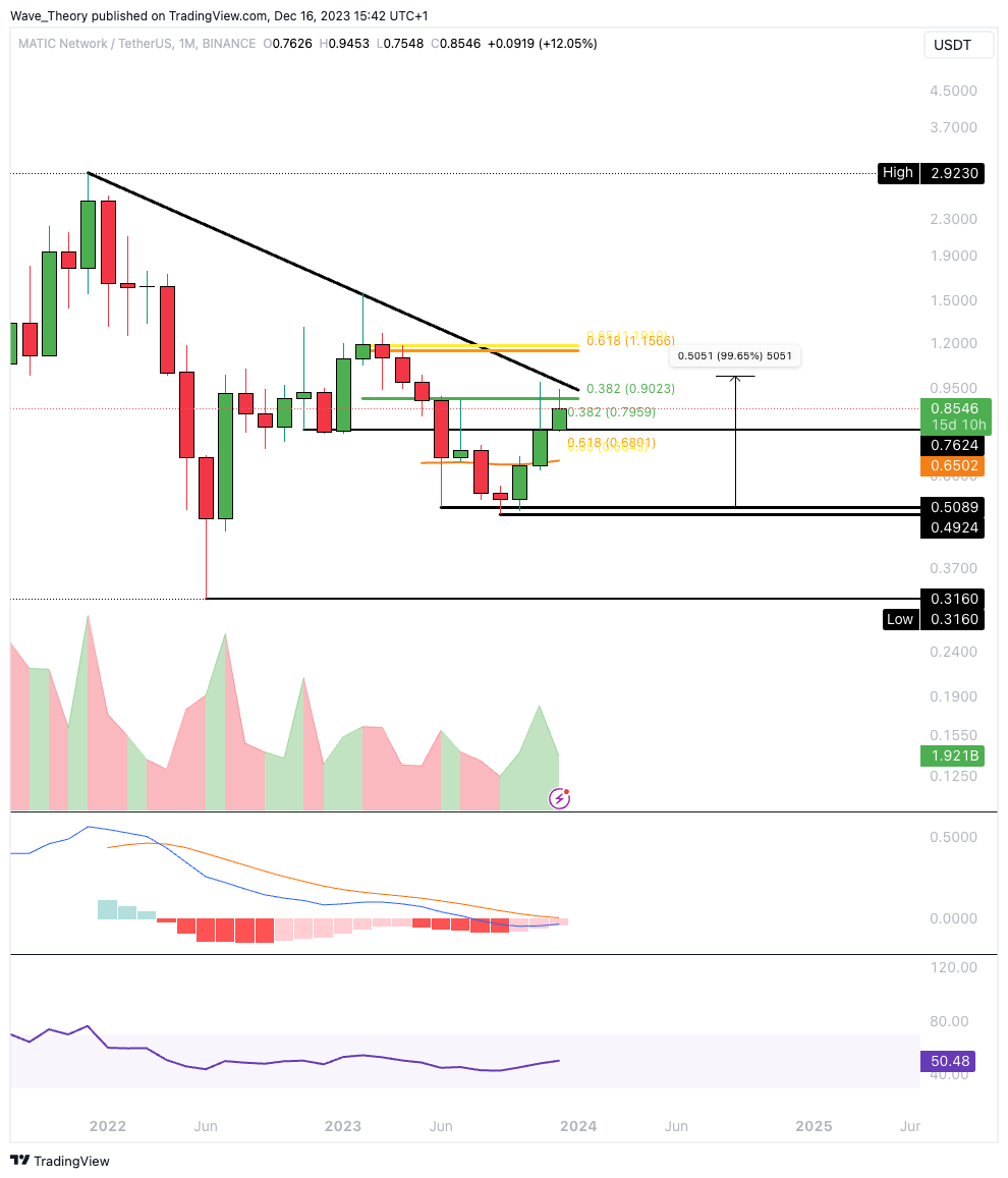 Nichtsdestoweniger findet Polygon an der 0,382 Fib Unterstützung bei rund 0,796 USD zusätzliche Unterstützung am 50-Wochen-EMA. Dort hat Poylgon gute Chancen, bullisch abzuprallen.
