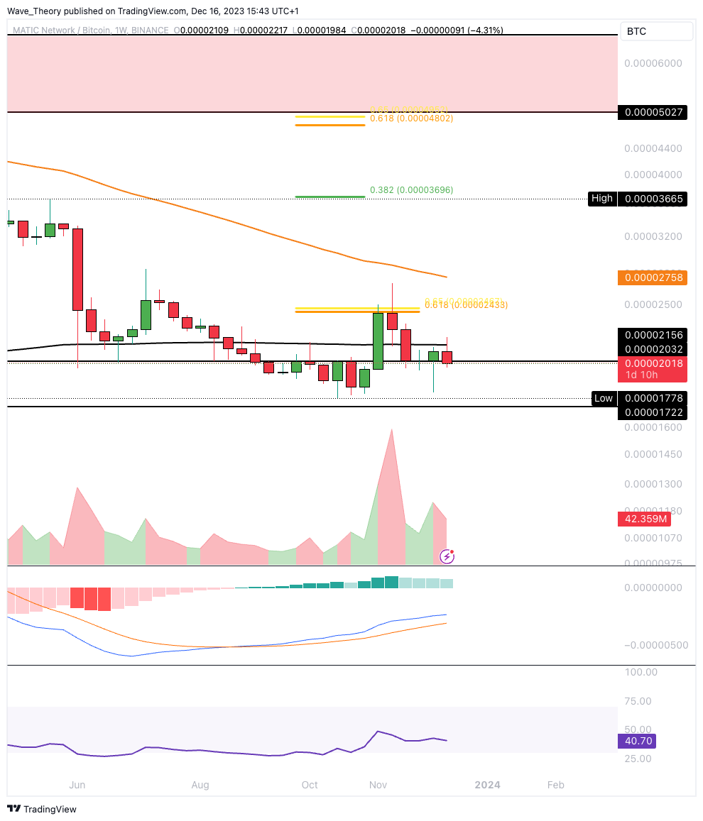 Gegen BTC befindet sich Polygon nach wie vor der Unterstützung zwischen rund 0,00001722 BTC und 0,00002032 BTC. Der 200-Wochen-EMA bei rund 0,00002157 BTC fungiert dabei als der nächste signifikante Widerstand.