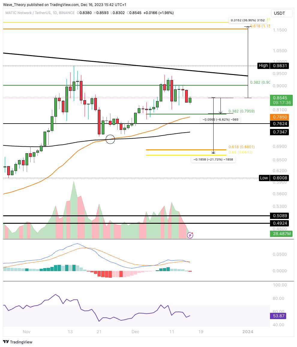 Polygon könnte jetzt um weitere 6,6 % korrigieren, um die 0,382 Fib Unterstützung bei rund 0,796 USD zu erreichen. Ansonsten wartet erst wieder bei rund 0,68 USD signifikante Fib Unterstützung auf MATIC.