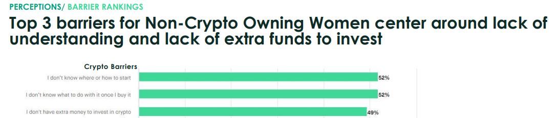 Leah Jones beschrieb einen der Faktoren bereits relativ gut: Keine Frauen auf Meetups. Das überschneidet sich auch mit einem Bericht von Bakkt. Dort heißt es, dass 52 Prozent aller Frauen nicht wissen, wo oder wie sie anfangen sollen. Diese Aussage war beim Bericht die Meist getroffene.