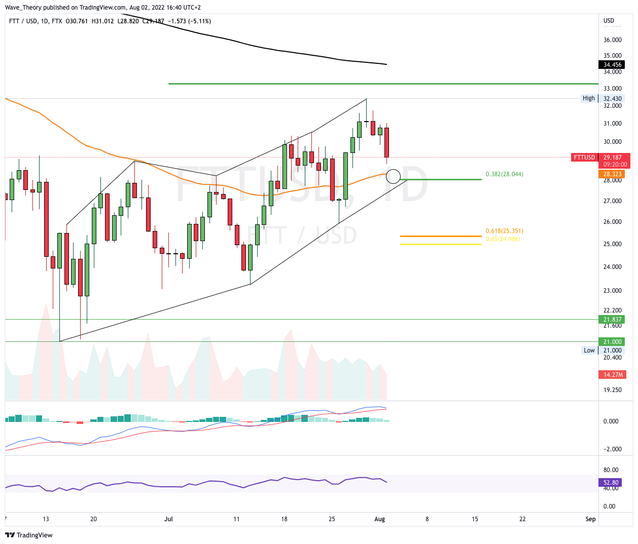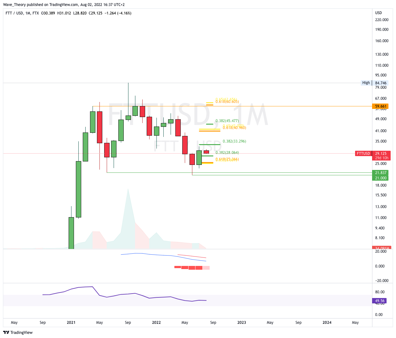 Der FTT Kurs könnte trotz der bullischen Aussichten im Monatschart jetzt kurzfristig korrigieren. FTT findet dabei bei rund 28 USD und bei rund 25 USD signifikante Fibonacci Unterstützungen. Der Tiefpunkt bei rund 21 USD dient ebenfalls als Unterstützung, bleibt womöglich aber unberührt.