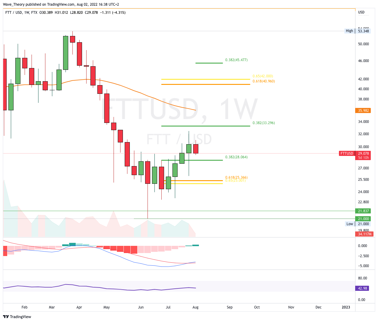 Der FTX Token konnte im Monatschart im Gegensatz zu vielen anderen Kryptowährungen wie Bitcoin und Ethereum eine bullische Kerzenformation im Monatschart bilden. Damit stehen die Chancen gut, dass der FTT Kurs im August stark steigen wird. FTT findet dabei bei rund 33,3 USD und bei rund 41 USD die nächsten signifikanten Fibonacci Widerstände.