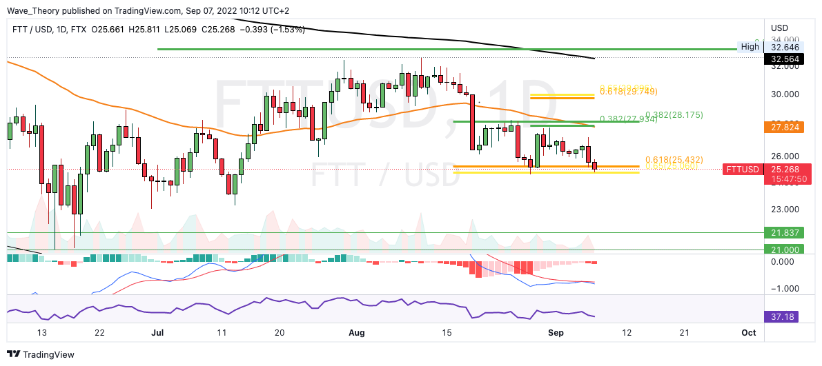 Ob der FTX Token Kurs jetzt erneut bullisch abprallen oder die Unterstützung bärisch brechen wird, hängt vom Verlauf des heutigen Tages ab. Immerhin tickt das Histogramm des MACDs im Tageschart bärisch tiefer und auch die MACD Linien sind bärisch überkreuzt, während sich der RSI neutral zeigt. Jedoch könnte der RSI eine bullische Divergenz aufbauen, sofern der FTT Kurs jetzt tiefer als 24,95 USD fällt.