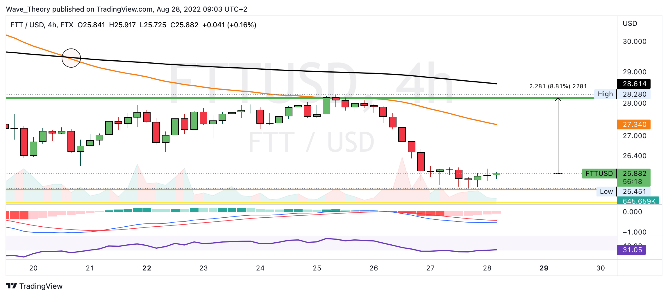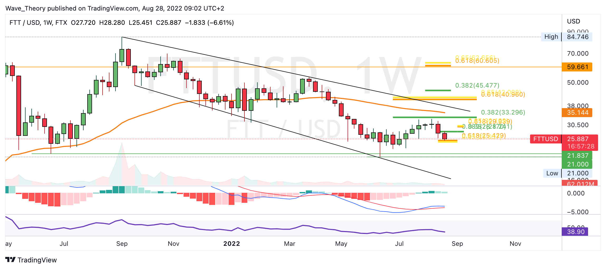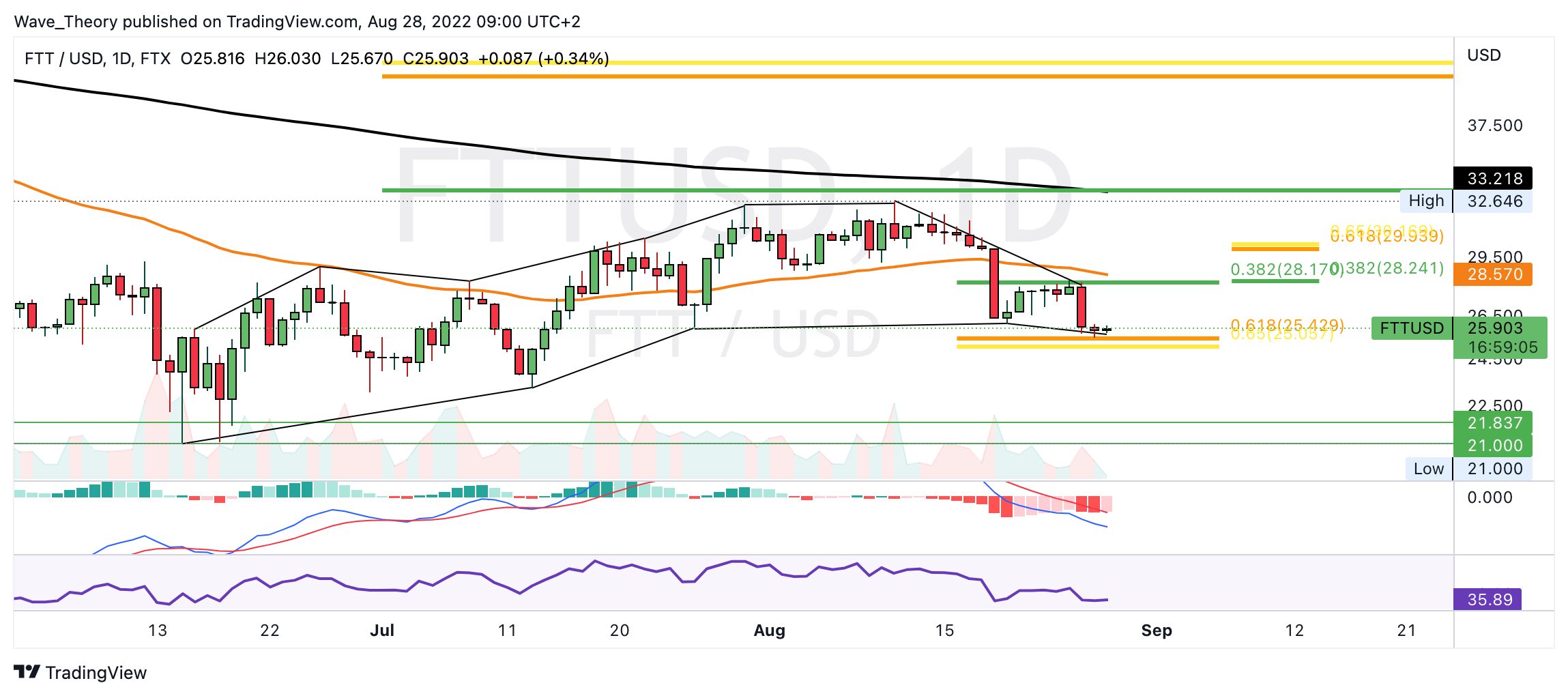 Tatsächlich fiel der FTT Kurs sehr stark, um die Golden Ratio Unterstützung bei rund 25 USD zu erreichen. Dort könnte der FTT Kurs jetzt abprallen, um zum nächsten Fib Widerstand bei rund 28,2 USD zu steigen. Die Korrektur bleibt aber intakt, sofern der FTT Kurs die Golden Ratio bei rund 30 USD nicht überwindet.