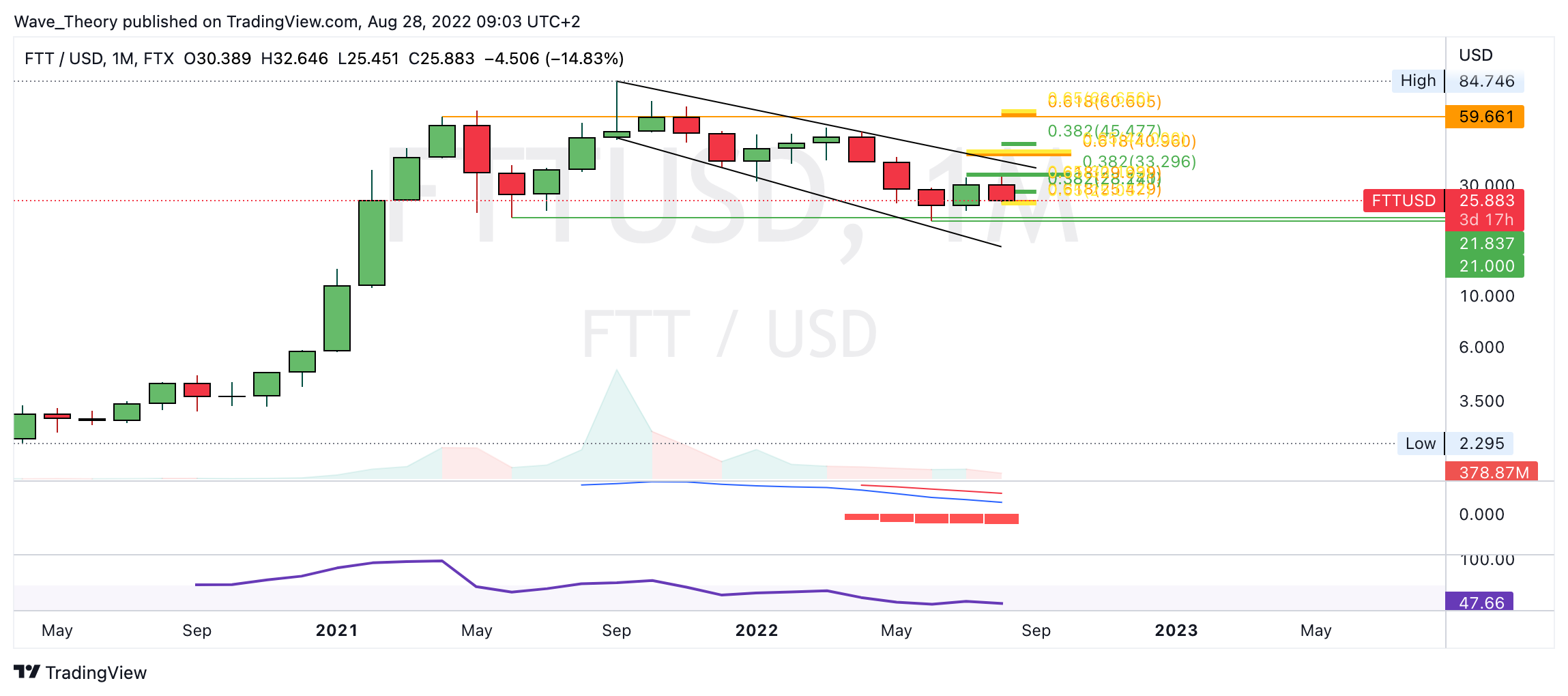 In der letzten FTT Kurs Prognose schrieben wir: “Der FTT Kurs könnte trotz der bullischen Aussichten im Monatschart jetzt kurzfristig korrigieren. FTT findet dabei bei rund 28 USD und bei rund 25 USD signifikante Fibonacci Unterstützungen. Der Tiefpunkt bei rund 21 USD dient ebenfalls als Unterstützung, bleibt womöglich aber unberührt.”