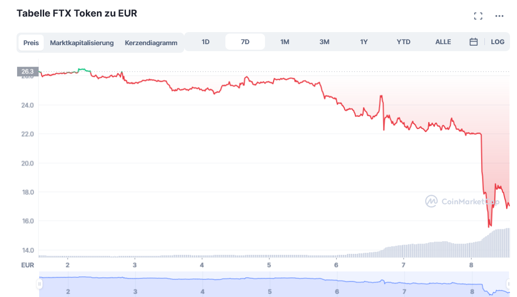 Im Mai war die Welt noch in Ordnung, Anleger und Kunden von FTX zufrieden und das Trading des hauseigenen Token FTT auf Binance lief gut. Klar, dass FTX-Anleger bei einem Kurs von 85,74 US-Dollar 01. September 2022 gute Laune hatten. Inzwischen liegt er auf Binance bei nur noch bei 17,61 US-Dollar und es finden keine Auszahlungen mehr statt.