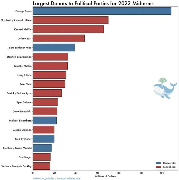 Politik mag Sam Bankman-Fried überaus gerne, denn er spendete gerade für die Midterms mehr als 40 Millionen US-Dollar und steht damit auf Nummer 5. Dass er plant, für den Wahlkampf 2024, 1 Milliarde US-Dollar zu spenden, verkündete er auf Twitter und löschte diesen Post kurz nach seiner Veröffentlichung wieder.