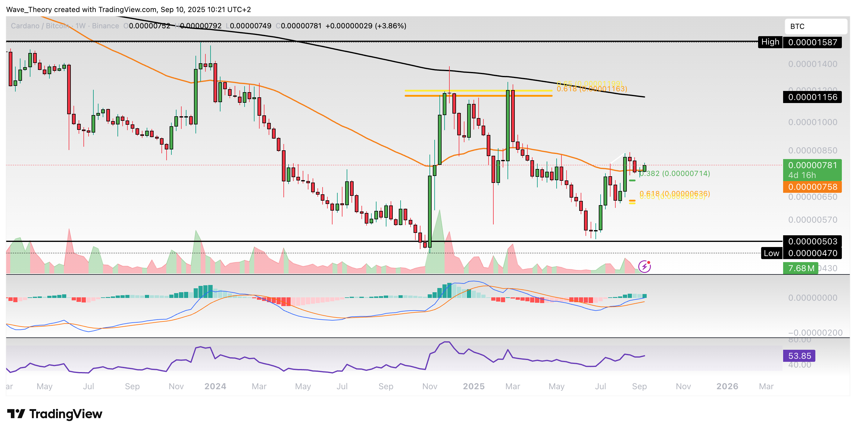 Gegen Bitcoin scheint der ADA Kurs jetzt am 50-Wochen-EMA bei rund 0,0000076 BTC bullisch abzuprallen, nachdem er zuvor zwei Wochen am Stück korrigiert war. Damit könnte Cardano mittelfristig erneut den Golden Ratio Widerstand bei rund 0,0000117 BTC anvisieren, woran der Kurs zuvor mehrfach bärisch abgewiesen wurde.