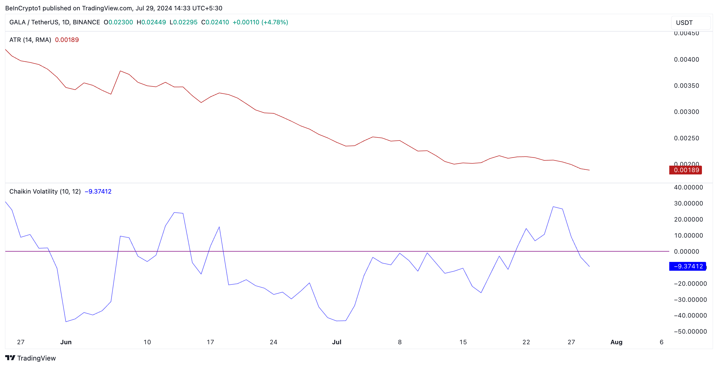 Da sich GALA seinem 50-Tage-SMA nähert, hat die Marktschwankung abgenommen. Dies basiert auf den Messungen einiger Volatilitätsindikatoren des Tokens. Zum Beispiel hat GALAs Average True Range (ATR), der seine Volatilität über einen bestimmten Zeitraum misst, seit Anfang Juli nach unten tendiert. Zum Zeitpunkt der Veröffentlichung liegt GALAs ATR bei 0,0018 und ist seitdem um 28 Prozent gefallen.