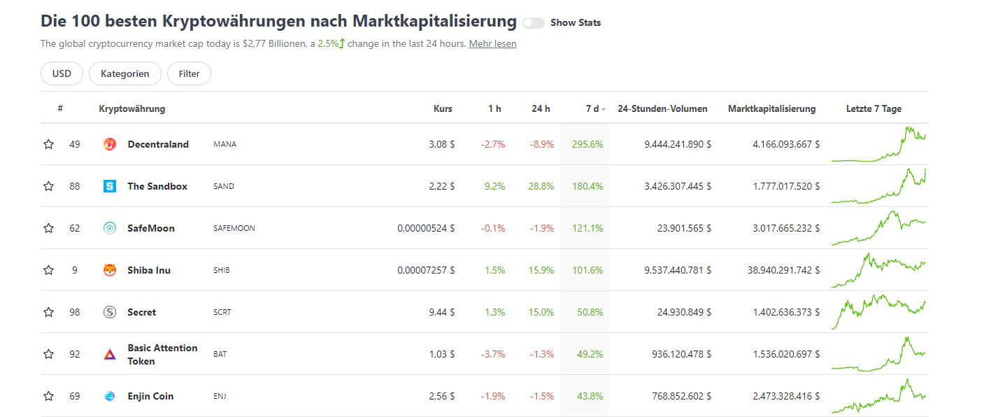 Nach den Facebook News stieg der Kurs des Gaming Token MANA von Decentraland stark an und konnte von den Top-100- Kryptowährungen die beste Performance hinlegen und sogar den Shiba Inu Kurs outperformen. Auch die Kurse der Gamingcoins SAND, und ENJI zählten zu den am besten performenten Kryptowährungen der letzten Woche. Doch was sind die Gründe für den massiven Preisanstieg der Gaming Coins?