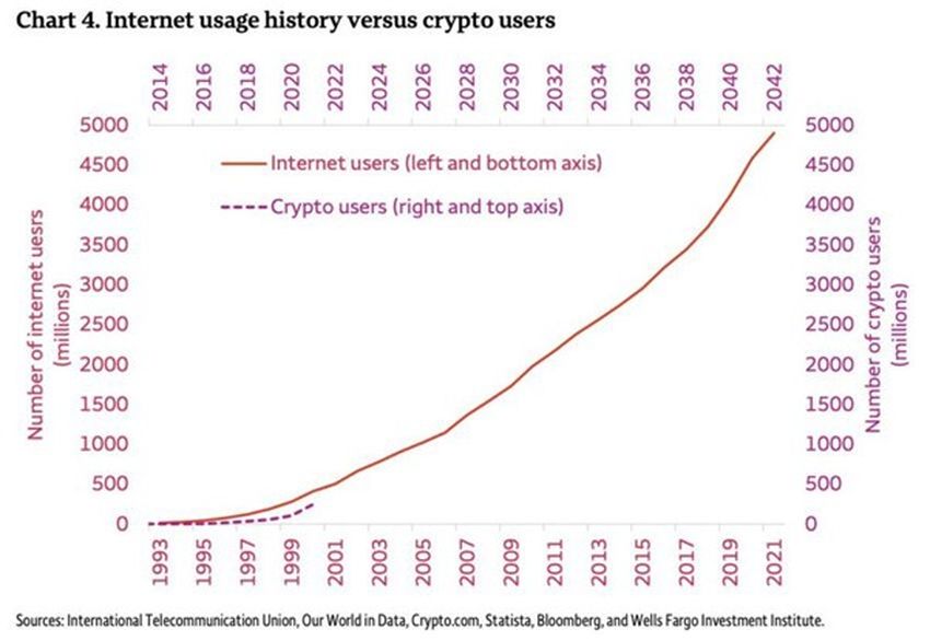 Kürzlich veröffentlichte Wells Fargo einen Bericht, der zeigt, dass die Entwicklung der Technologie und des Kryptomarktes einem ähnlichen Muster folgt wie die des Internets vor 20 Jahren. Wells Fargo ist ein amerikanisches multinationales Finanzdienstleistungsunternehmen mit Hauptsitz in San Francisco. Das Unternehmen wird im Jahr 2020 ein Vermögen von 1.955 Billionen US-Dollar verwalteten.