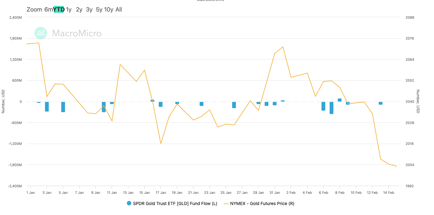 Die Abflüsse aus börsengehandelten Goldfonds (ETFs) erreichen mittlerweile über 2 Milliarden USD für das Jahr 2024. Ironischerweise verzeichnete der BlackRock Gold ETF mit 423,6 Mio. USD die zweithöchsten Verluste, während die Zuflüsse in Bitcoin Spot ETF am 14. Februar 5 Mrd. USD erreichten.